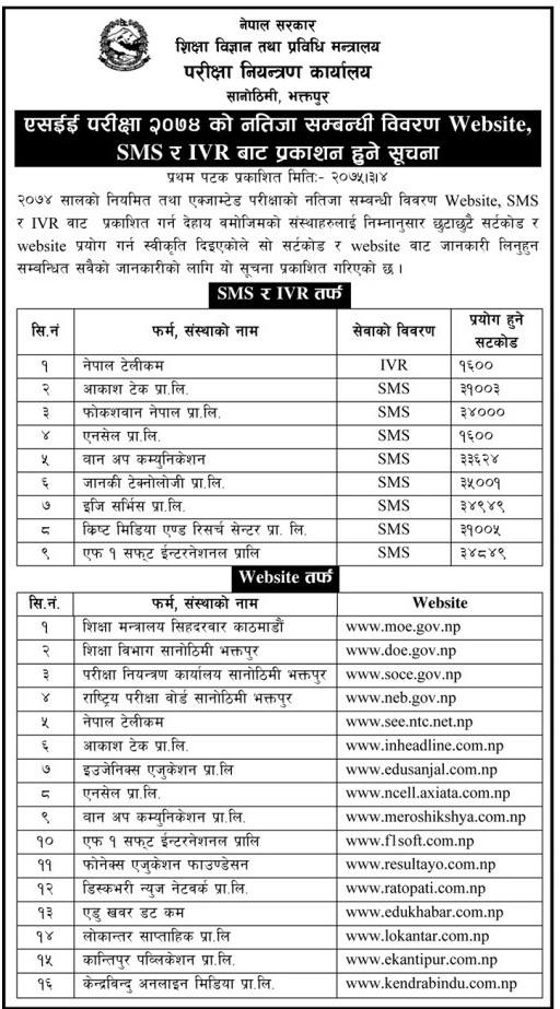 एसईईको नतिजा एसएसमएस, अइभीआर तथा वेबसाइटबाट हेर्न सकिने छ । आइभीआरतर्फ नेपाल टेलिकमबाट १६०० मा फोन गरी नतिजा सुन्न सकिन्छ ।