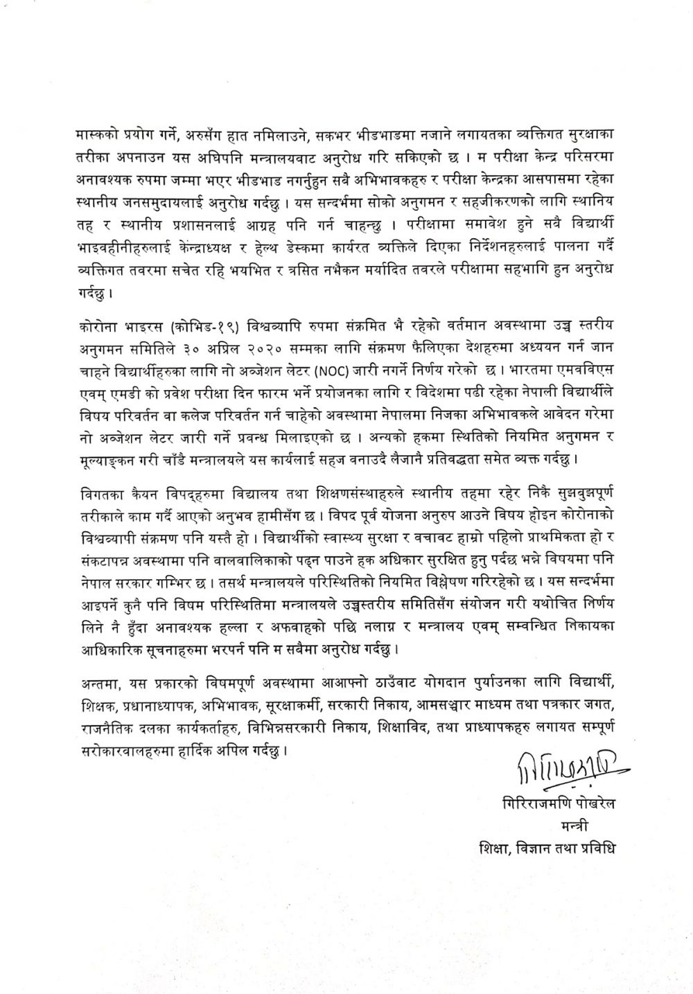 मन्त्री गिरिराजमणि पोखरेलले मंगलबार अपिलपत्र जारी गर्दै अर्को शैक्षिक सत्र शुरु नहुन्जेल विद्यालय जाने बालवालिकाहरुलाई अनावश्यक रुपमा घरबाहिर भीड्भाडमा ननिस्कन आग्रह गरेका हुन् । विज्ञप्तिमा भनिएको छ– ‘विश्वव्यापी फैलिँदै गएको कोरोना भाइरसको संत्रासका कारण आवश्यक सतर्कता अपनाउन चैत ५ गतेभित्र कक्षा १ देखि ९ सम्म परीक्षा सञ्चालन गरिसक्न अनुरोध गरिएको थियो, यो परीक्षा समाप्त भएपछि अर्को शैक्षिक सत्र सुरु नहुन्जेलसम्म करिब तीन हप्ता देशभरका करिब ७० लाख विद्यालय जाने उमेरका बाललिकाहरु घर परिवारमा नै रहने छन्। बालबालिकालाई घर बाहिर नजान, विद्यालयमा सांस्कृतिक कार्यक्रम, अभिभावक दिवस, नतिजा सार्वजनिकीकरण, प्रवेश परीक्षा वा भर्नाको नाममा भीडभाड वा आम भेला नगर्न सबैमा अनुरोध छ।’