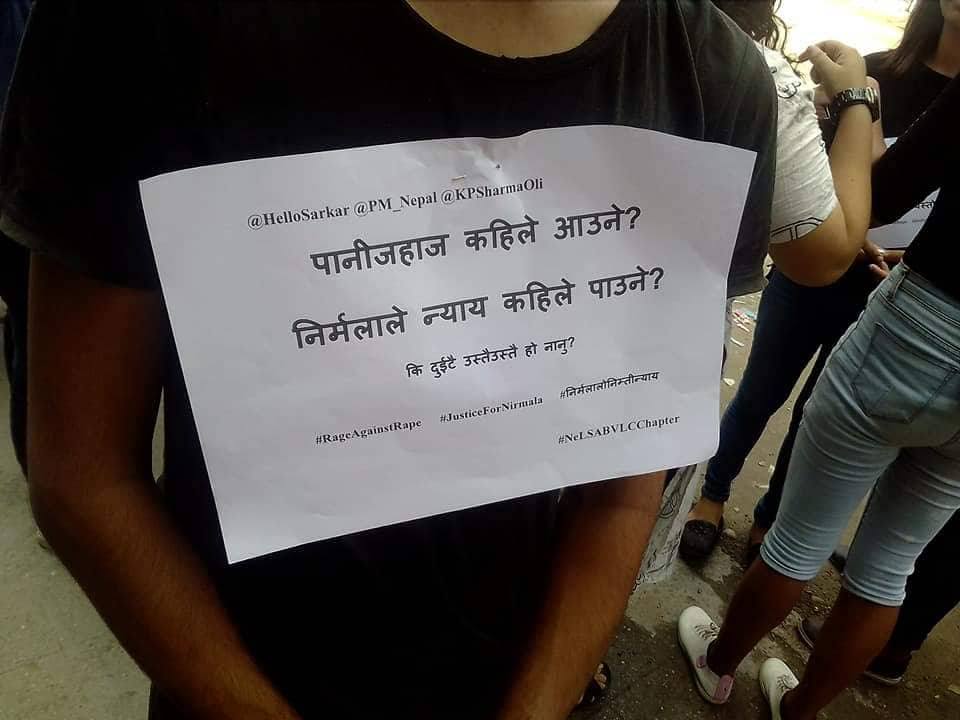 प्रदर्शनमा सहभागिहरुले ‘सरकारले देखायो लाचारी त्यसैले हाम्रो खबरदारी’, ‘बलात्कारीलाई जोगाउन पाइँदैन’, ‘पानीजहाज कहिले आउने, निर्मलाले न्याय कहिले पाउने ? कि दुवै उस्तै हुन् ? ’ ‘सरकारले कहिले देखाउने इच्छा ? खै त महिलाको सुरक्षा ’ लगायतका नारा लेखिएका कार्डहरु छातीमा टाँसेका थिए ।