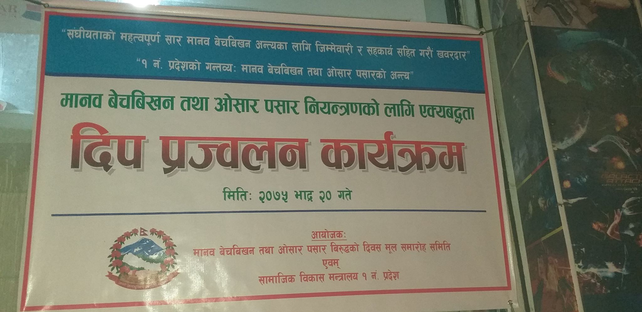“संघीयताको महत्वपुर्ण सार मानव बेचबिखन अन्त्यका लागि जिम्मेवार र सहकार्य सहित गरौँ खबरदार” भन्ने मुल नारा सहित मानव बेचबिखान नियन्त्रणका लागि प्रदेश नं १ सामाजिक विकास मन्त्रालयको आयोजनामा विराटनगरको महेन्द्र चौकमा दीप प्रज्वलन गरिएको हो ।