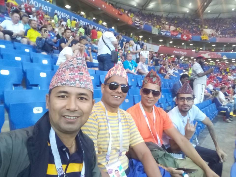 उनीहरुले केहि दिन अगाडिको ब्राजिल र स्विजरल्याण्डबिचको खेल हेरेका थिए । नेपाली राष्ट्रिय झण्डा बोकेर उनीहरु खेल मैदानमा प्रवेश गर्दा धेरै दर्शकका आँखा उनीहरुमाझ अडिएका थिए । रुसका विभिन्न रंगशालामा चन्द्रसूर्य अंकित नेपालको राष्ट्रिय झण्डा फहराउँदै विश्वकपको पास भिरेका धेरै युवा विदेशीमाझ आफै रमिरहेका थिए ।