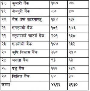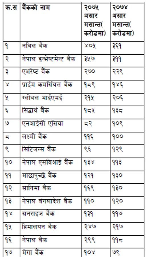 ४ अर्ब ५ करोड नाफा कमाएर नविल बैंक पहिलो नम्बरमा रहेको छ भने । ३ अर्ब ६७ करोड नाफा कमाएको कृषि विकास बैंक दोश्रो र ३ अर्ब ५७ करोड नाफा कमाएर नेपाल इन्भेष्टमेन्ट बैंक तेश्रो नम्बरमा रहेको छ ।