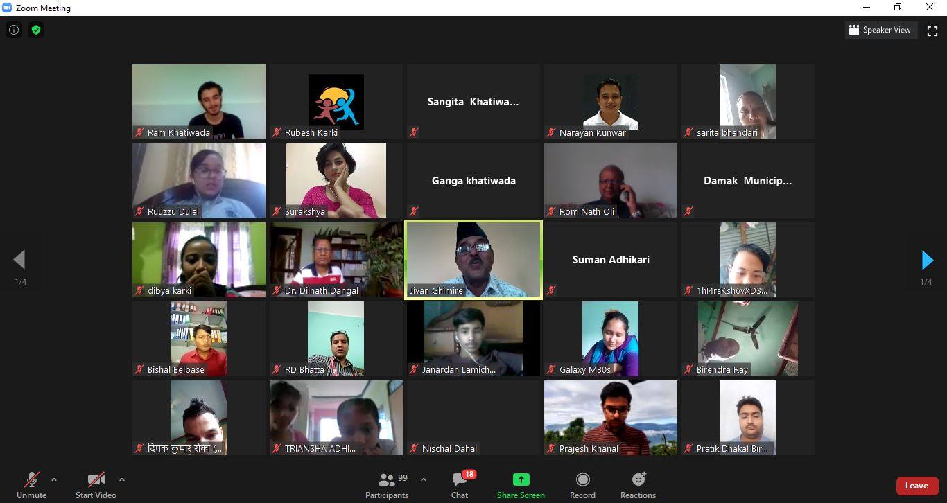 प्रदेश नं. १ सामाजिक विकास मन्त्री जीवन घिमिरेको प्रमुख आतिथ्यतामा सम्पन्न भर्चुअल संवादमा घिमेरे होम आईसोलेसनबाटै जोडिएका थिए ।घिमिरेले कोरोनाका सन्दर्भमा आफ्नो अनुभव सहित सबैलाई सचेत रहन जानकारी गराए । उनले आफ्नो बालयकालका बारेमा बताएका थिए । खोटाङ जिल्लाको हौचुर भन्ने ठाउँमा जन्म भएको जानकारी दिँदै घिमिरेले पढ्न जाँदा काठको पाटि बोकेर उकालो चढी विद्यालय जाने गरेको र माटोको डल्ला फुटाएर सिन्काले लेख्दै पढेको भन्दै आफ्नो बाल्यकाल सम्झिएका थिए ।