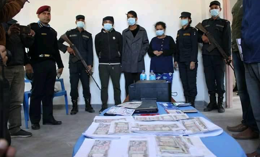नेपाली एक हजारका नक्कली नोट बनाएर बजारमा सामान खरिद गरेका अभियोगमा दुई भारतीयसहित एक नेपाली युवकलाई प्रहरीले पक्राउ गरेको छ । आज जिल्ला प्रहरी कार्यालय कञ्चनपुरमा आयोजना गरिएको पत्रकार सम्मेलनमा नक्कली नोट, एक थान ल्यापटप, प्रिन्ट गर्ने मेसिनसहित कागजात र अभियुक्तहरुलाई सार्वजनिक गरिएको छ ।
