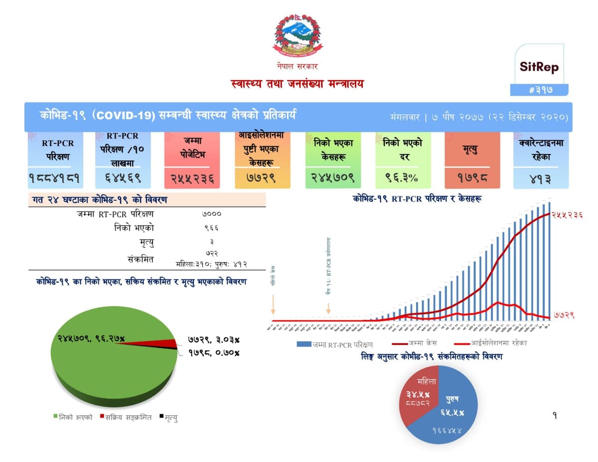 ७ पुष, काठमाडौं । पछिल्लो २४ घण्टामा नेपालमा थप ७२२ जनामा कोरोना भाइरसको संक्रमण पुष्टि भएसँगै कोरोना संक्रमितको संख्या २ लाख ५५ हजार २३६ पुगेको छ ।