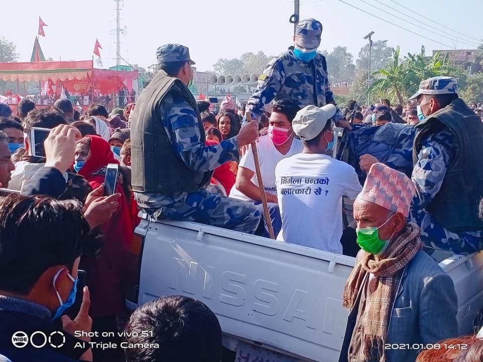 शुक्रबार धनगढीमा भएको कार्यक्रममा आफ्नो टिसर्टमा निर्मला पन्तको बलात्कार र न्यायको खोजीसँग सम्बन्धित नाराहरु लेखिएको टिसर्ट लगाएका युवाहरु लाई प्रहरीले पक्राउ गरेको हाे ।