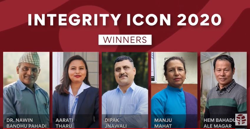 इन्टेग्रीटी आइकन २०२० का लागि छनौट भएका व्यक्तिहरुमा आरती थारु,जनस्वास्थ्य निरीक्षक, नेपालगञ्ज स्वास्थ्यचौकी दिपक ज्ञवाली, महाशाखा प्रमुख, उद्योग, पर्यटन, बन तथा वातावरण मन्त्रालय, लुम्विनी प्रदेश, बुटवल, हेमबहादुर आले मगर, बाली संरक्षण अधिकृत, कृषि ज्ञान केन्द्र, ओखलढुंगा, मञ्जु महत, अधिकृत, महिला, बालबालिकातथा ज्येष्ठ नागरिक शाखा, मंगलसेन नगरपालिका, अछाम, र डा. नविनबन्धु पहाडी, शिक्षक, नीलकण्ठ उच्चमाध्यामीक विद्यालय, धादिङका रहेका छन् ।