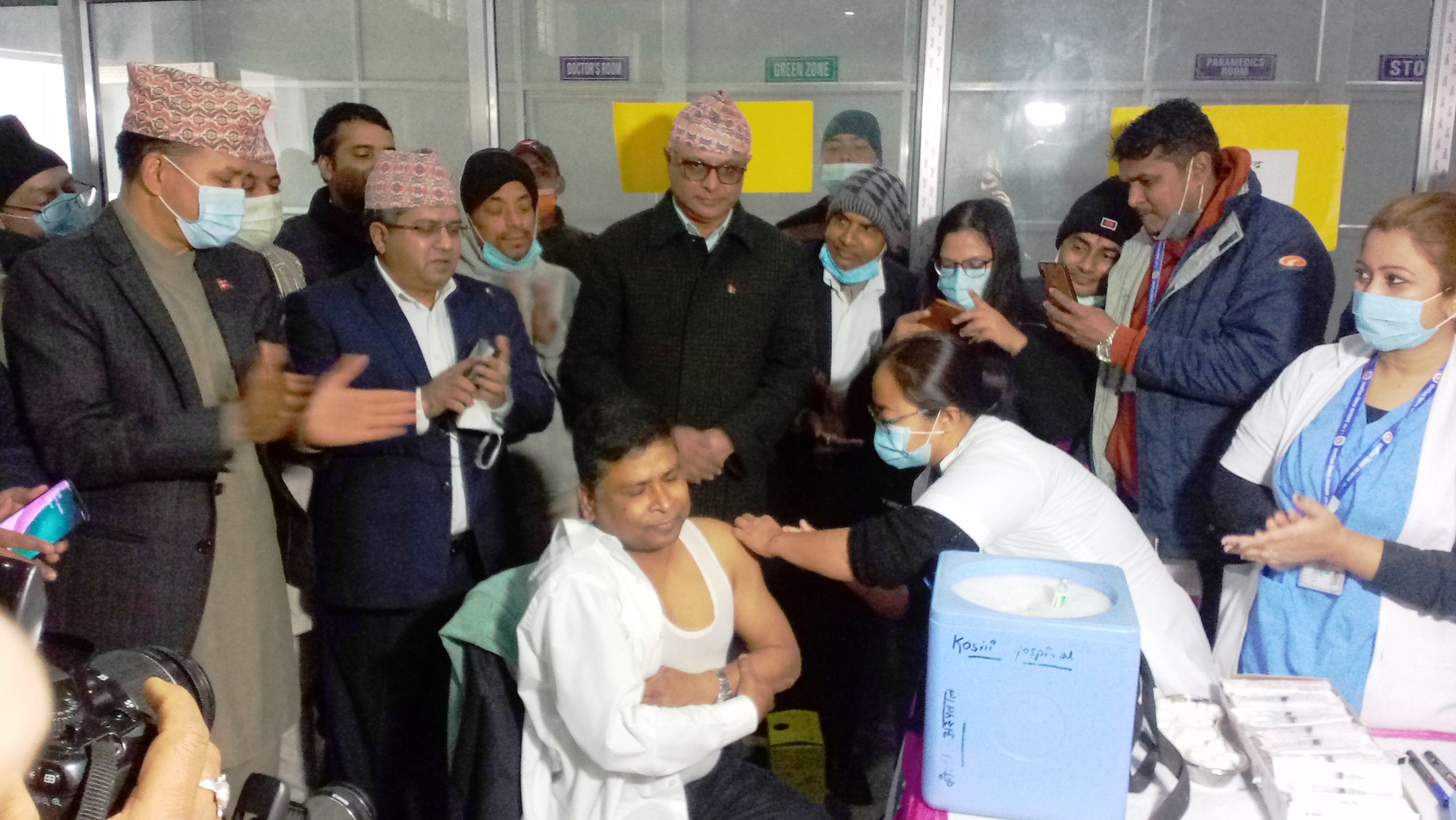 कोशी अस्पतालका मेडिकल सुपरीटेन्डेन्ट डा. चुमनलाल दास र बरिष्ठ फिजिसियन डा. दीपक सिग्देललाई खोप लगाएर प्रदेश १ मा कार्यक्रमको शुरुवात गरिएको छ । आज ८ जिल्लाका १९ वटा खोप केन्द्रमा खोप लगाईने प्रदेश स्वास्थ्य निर्देशनालयका निमित्त निर्देशक ज्ञानबहादुर वस्नेतले बताए ।