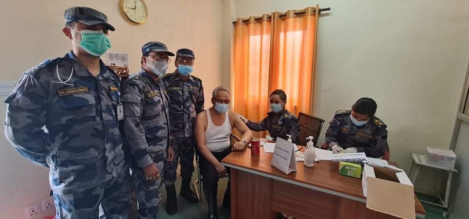 थापाले आइतबार बिहान सशस्त्र प्रहरी अस्पताल बलम्बु पुगेर कोरोनाविरुद्धको खोप लगाएका हुन्।