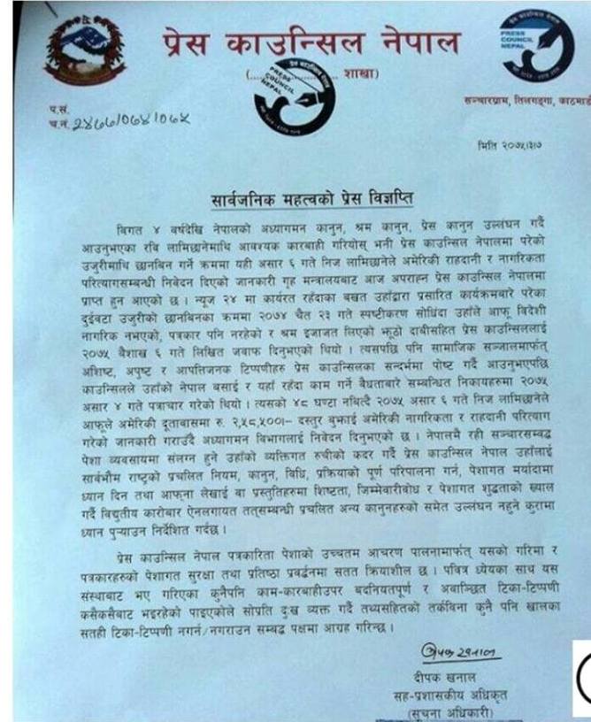 विज्ञप्तिमा भनिएको छ–‘त्यसपछि पनि सामाजिक सञ्जालमार्फत् अशिष्ट, अपुष्ट र आपत्तिजनक टिप्पणीहरु प्रेस काउन्सिलका सन्दर्भमा पोष्ट गर्दै आउनुभएपछि काउन्सिलले उहाँको नेपाल बसाई र यहाँ रहँदा काम गर्ने वैधताबारे सम्बन्धित निकायहरुमा २०७५ असार ४ गते पत्राचार गरेको थियो । त्यसको ४८ घण्टा नबित्दै २०७५ असार ६ गते निज लामिछानेले आफूले अमेरिकी दूतावासमा रु। २,५८,५००।— दस्तुर बुझाई अमेरिकी नागरिकता र राहदानी परित्याग गरेको जानकारी गराउँदै अध्यागमन विभागलाई निवेदन दिनुभएको छ ।’