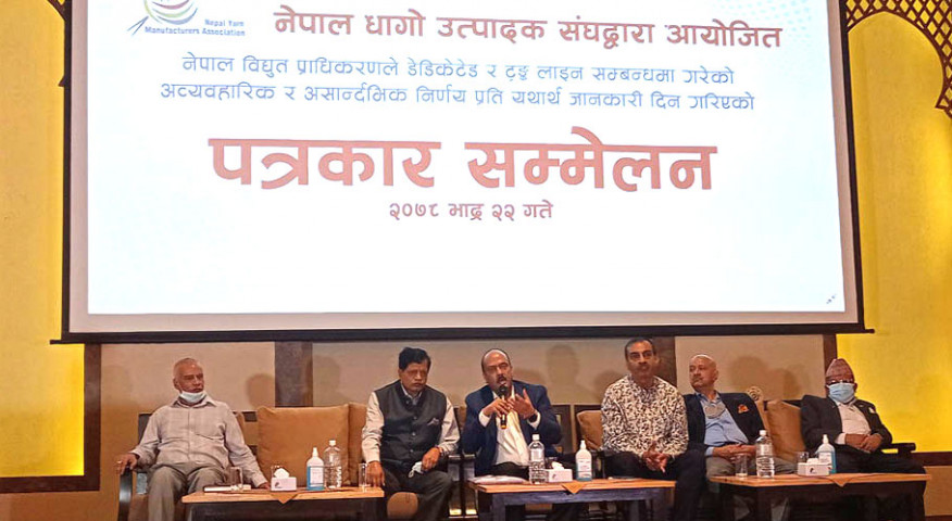 मंगलबार काठमाडौंमा पत्रकार सम्मेलन गर्दै नेपाल धागो उत्पादक संघले २४ सै घण्टा विद्युतको प्रयोग नगरेको हुनाले प्राधिकरणलाई डेडिकेटेड र ट्रंक लाइनको बक्यौता महशुल नतिर्ने बताएको हो।