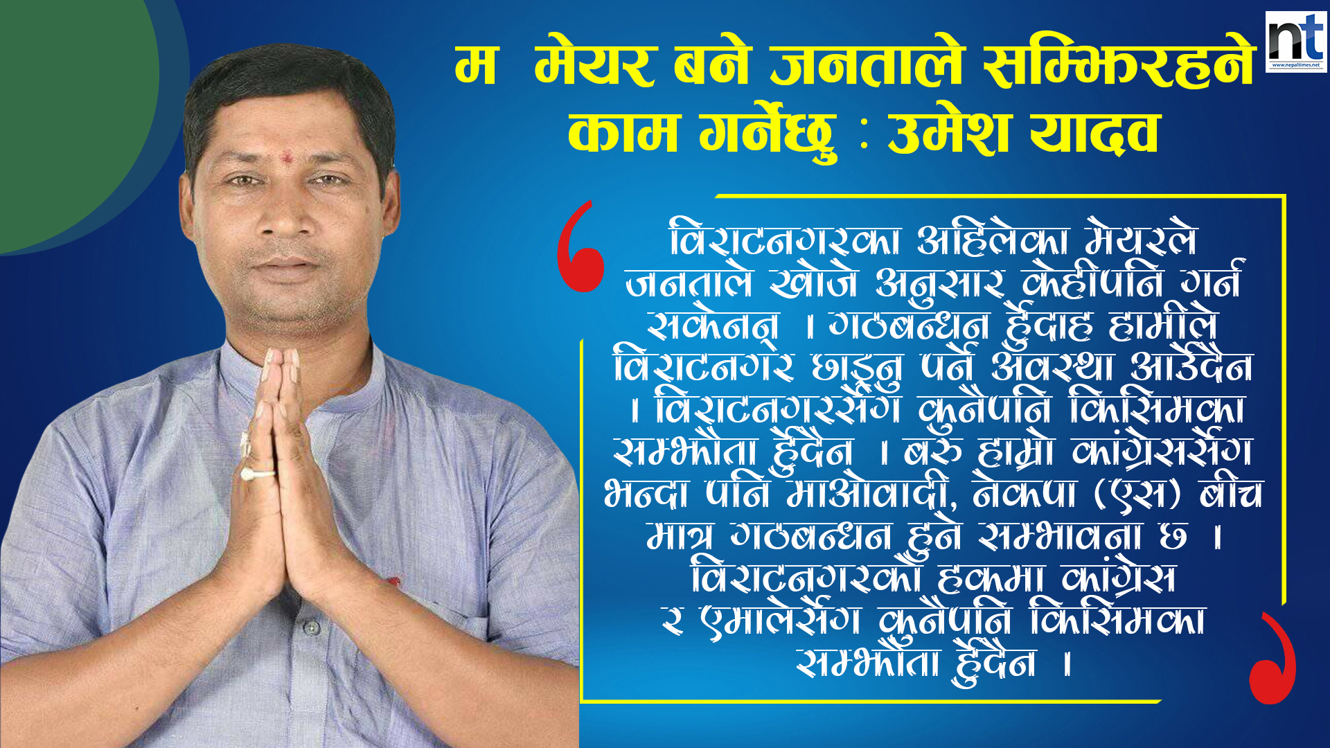 २०७४ को स्थानीय तह निर्वाचनमा विराटनगर महानगरपालिकामा तत्कालीन संघीय समाजवादी पार्टीको तर्फबाट मेयर पदका उम्मेदावार उमेश यादवले कडा टक्कर दिएका थिए । सो निर्वाचनमा धेरै मत बदर हुँदा आफु तेस्रो स्थानमा सिमित बनेको उनी बताउदै आएका छन् । आगामी निर्वाचनमा पुनःजनता समाजवादी पार्टी (जसपा) को तर्फबाट विराटनगरमा मेयर पदको उम्मेदवार बन्ने यादवको आकांक्षा राखेका छन् । प्रस्तुत छ, यसै सेरोफेरोमा नेपाल टाईम्सका किशोर विश्वकर्माले नेता यादवसँग गरेको कुराकानीको सम्पादित अंश ।