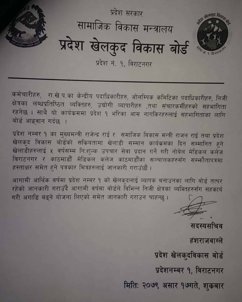 सोही दिन नोबेल र काठमाण्डौ मेडिकल कलेज एण्ड टिचिङ अस्पतालसँग खेलाडीको आगामी पाँचवर्षसम्म उपचार हुने गरि सम्झौता गरिने कार्कीले जानकारी दिइन् । बोर्डले प्रदेश १ को खेलकुदलाई व्यापक बनाउन निजी क्षेत्रसँग सहकार्य गरेर अघि बढ्ने योजना रहेको जनाएको छ ।