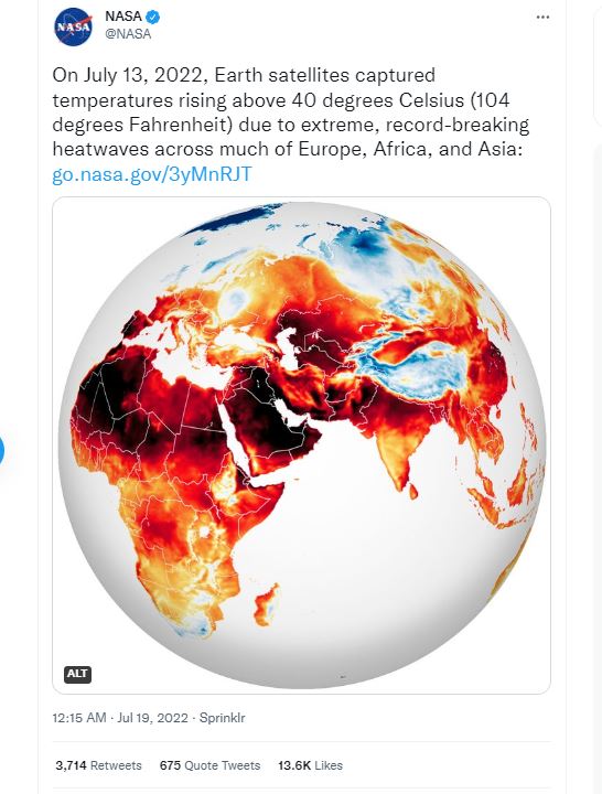 अमेरिकी अन्तरिक्ष एजेन्सी नासाले एसिया, युरोप, उत्तर अफ्रिका र पश्चिम एसियामा चर्को गर्मीबारे विश्वलाई चेतावनी दिएको छ । यी सबै ठाउँमा तापक्रम ४० डिग्री नाघेको छ भने धेरै ठाउँमा गर्मीले रेकर्ड तोडेको छ । नासाद्वारा सार्वजनिक यो तस्विरले पूर्वी गोलार्धमा सतहको तापक्रम कस्तो छ भनेर देखाउँछ। यो तस्बिरमा यो नीलो धरती चर्को गर्मीका कारण रातो देखिन्छ । यो तस्विरमा उत्तरी भारत पनि कडा गर्मीको सामना गरिरहेको देखिन्छ। नासाको गोडार्ड स्पेस फ्लाइट सेन्टरका स्टिभन पावसनले विभिन्न ठाउँमा चिसो हुँदा देखिने निलो रङ अहिले रातोमा परिणत भएको जुन अत्यधिक गर्मीको सङ्केत हो भन्ने स्पष्ट रूपमा देखिएको बताएका छन् । पृथ्वीको यो विशाल क्षेत्र चर्को गर्मीको चपेटामा छ ।