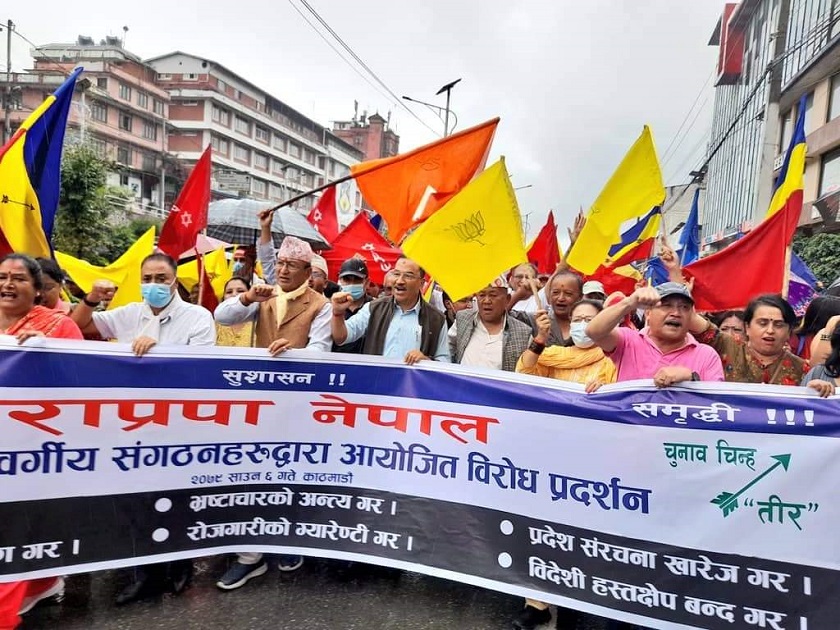 राप्रपा नेपालका जनवर्गीय संगठनहरुले विभिन्न मागहरु राख्दै संयुक्त रुपमा राजधानीमा विरोध प्रदर्शन गरेका छन् ।प्रदेश संरचना खारेज हुनुपर्ने, धर्मनिरपेक्षता खारेज गरि सनातन हिन्दुराष्ट्रको पहिचान कायम हुनुपर्ने, भ्रष्टाचारको अन्त्य गरि भ्रष्टाचारिलाई कारबाही गरिनुपर्ने, रोजगारीको सुनिश्चितता हुनुपर्ने उसको माग छ ।यस्तै महङ्गी र कालोबजारी नियन्त्रण गरिनुपर्ने, वैदेशिक हस्तक्षेप अन्त्य हुनुपर्ने माग गर्दै माईतिघर मण्डलाबाट जुलुस निकालिएको छ । प्रदर्शनमा जनवर्गीय संगठनका नेता, कार्यकर्तासँगै पार्टीका नेताहरुको समेत सहभागिता छ ।राप्रपा नेपाललाई पुनर्जागृत गरेपछि पछिल्लो समय कमल थापा नेतृत्वमा रहेको राप्रपा नेपाल संगठन निर्माणसँगै सडक केन्द्रीत भएको पार्टीका महामन्त्री राजाराम बर्तौलाले बताए ।