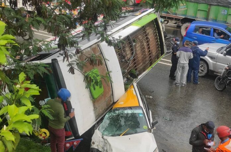 ललितपुरको ग्वार्कोमा ट्याक्सीमाथि बस पल्टिएको छ । बुधबार बिहान बीएण्डबी अस्पताल नजिकै बस ट्याक्सीमाथि पल्टिएको जिल्ला प्रहरी परिसर, ललितपुरले जनाएको छ ।प्रहरीका अनुसार बा ३ ख ४४४० नम्बरको बस बा २ ज ६०१ नम्बरको ट्याक्सीमाथि पल्टिएको थियो । घटनामा ट्याक्सी चालक सञ्जोग घिसिङ घाइते भएको ललितपुरका डीएसपी अंगुर जिसीले बताए । उनका अनुसार घिसिङको गर्धनमा चोट लागेको छ ।