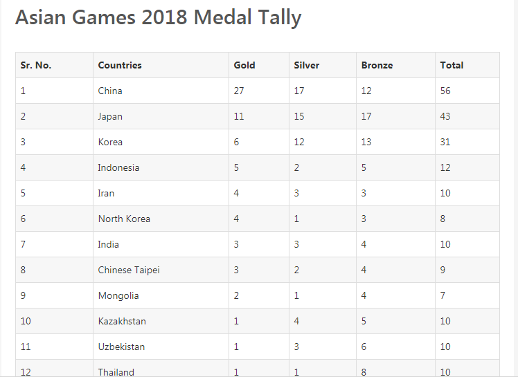 एसियाडको तेस्रो दिनसम्म आइपुग्दा २२ वटा देशले पदकमा नाम लेखाएका छन् । प्रतियोगिता चीनले सुरुवातदेखि नै अग्रता कायम राखेको छ । चीनले मंगलबारसम्म ५६ पदक जितिसकेको छ । जसमा २७ स्वर्ण १७ रजत र १२ कास्य जितेको छ । ११ स्वर्ण, १५ रजत र १७ कास्य जितेका जापान दोस्रो स्थानमा रहँदा ६ स्वर्ण र १२ रजत र १३ कास्यसहित दक्षिण कोरिया तेस्रो स्थानमा छ ।