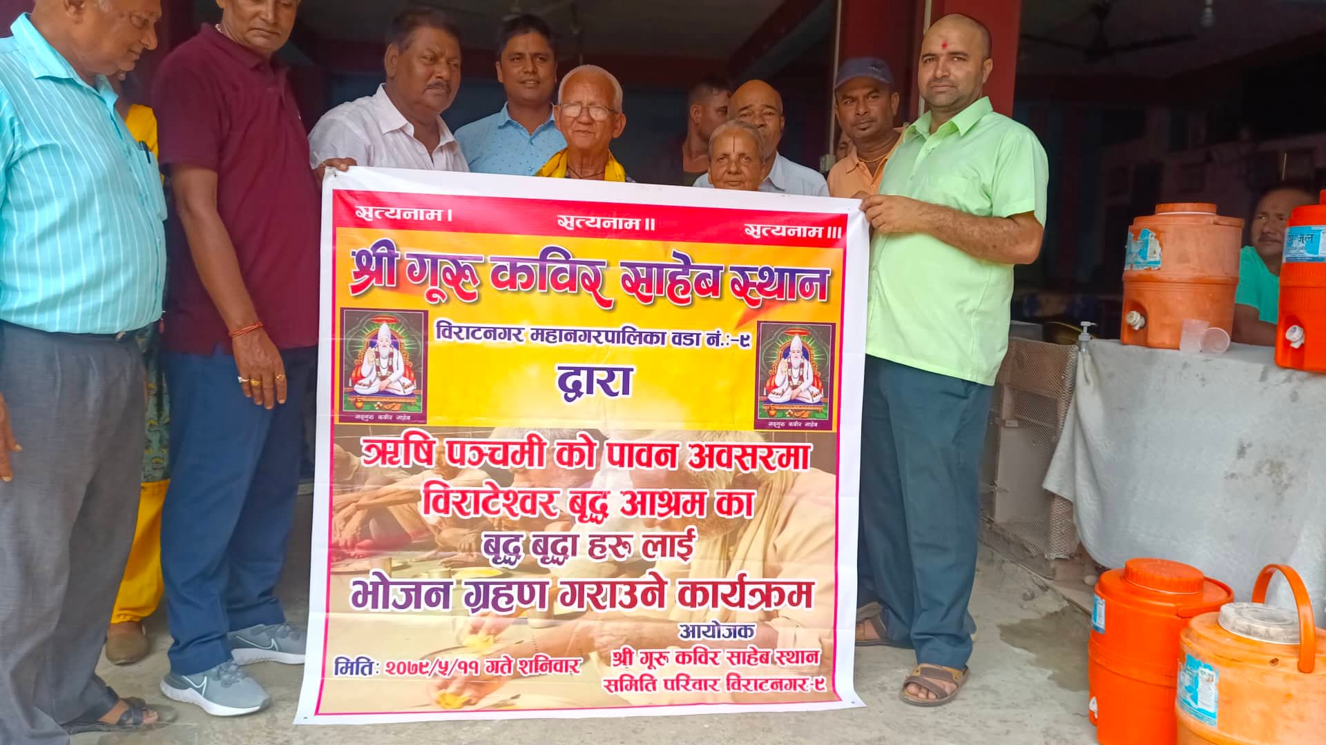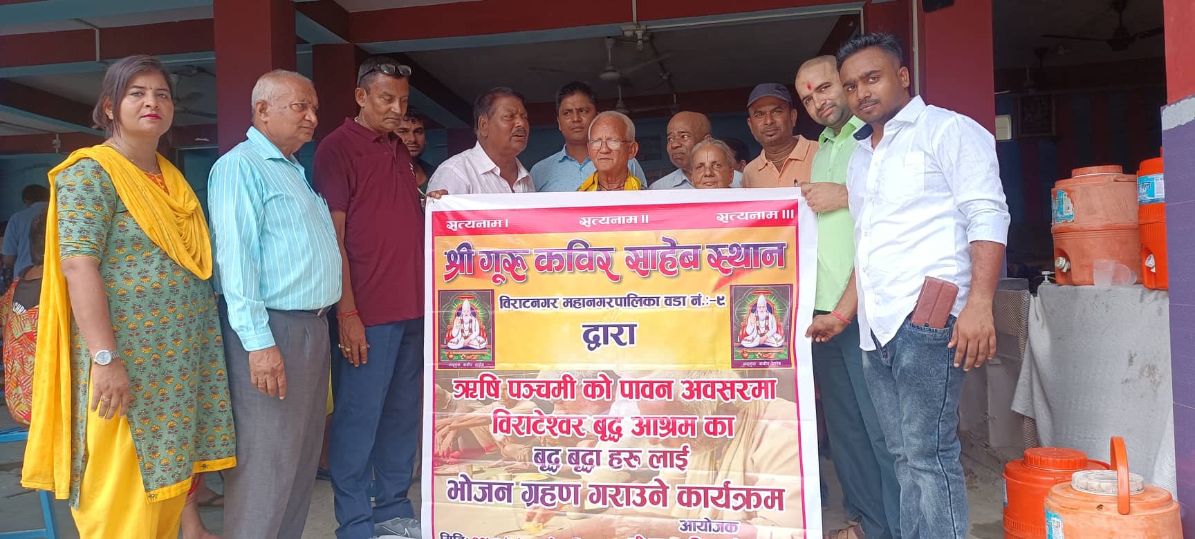 आउँदै गरेको ऋषी पञ्चमीको अवसर पारेर श्री गुरु कविर साहेव स्थान विराटनगरले वृद्ध आश्रममा रहेका जेष्ठ नागरिकलाई जलपान गराएको छ । विराटनगर ८ अशोक चोकमा रहेको विराटेश्वर वृद्धाश्रमका ६३ वृद्धवृद्धालाई साहेव स्थानले शनिवार जलपान गराएको हो ।