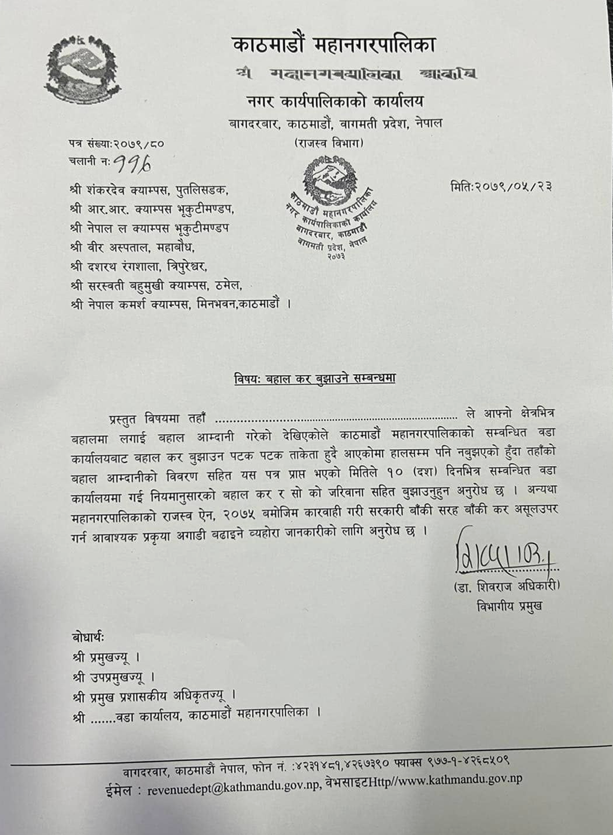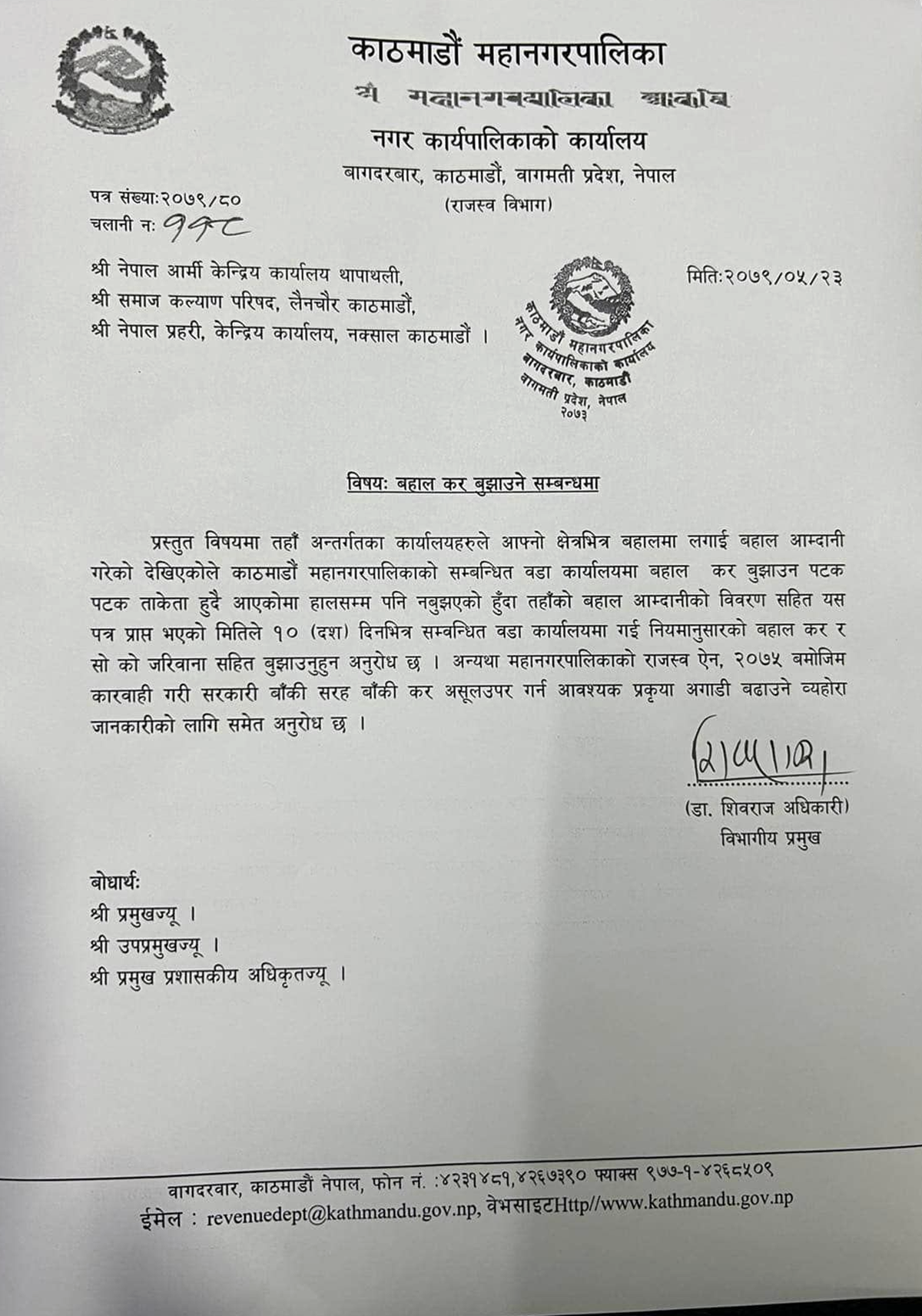 ‘आफ्नो क्षेत्रभित्र बहालमा लगाई बहाल आम्दानी गरेको देखिएकोले काठमाडौं महानगरपालिकाको सम्बन्धित वडा कार्यालयमा बहाल कर बुझाउन पटकपटक ताकेता हुँदै आएको छ। तर हालसम्म पनि नबुझएको हुँदा त्यहाँको बहाल आम्दानीको विवरणसहित यस पत्र प्राप्त भएको मितिले १० (दश) दिनभित्र सम्बन्धित वडा कार्यालयमा गई नियमानुसारको बहाल कर र सोको जरिवानासहित बुझाउनुहुन अनुरोध छ।’ उक्त पत्रमा थप भनिएको छ ।