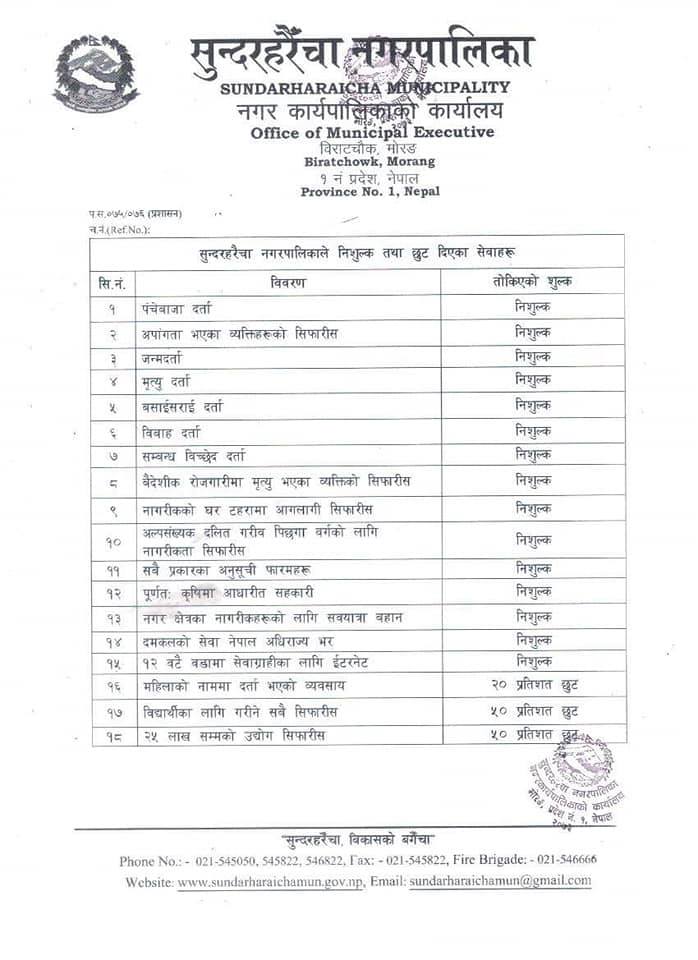 देशभर बृद्धि भएको करको बिरोध भईरहेका बेला मोरङको सुन्दरहरैँचा नगरपालिकाले भने १८ वटा शिर्षकमा कर निशुल्क गरेको छ । नगरपालिकाले पञ्चेबाजा दर्ता,अपांगता भएका ब्यक्तिहरुको सिफारिस,जन्मदर्ता,मृत्युदर्ता,बसाईसराई दर्ता,बिवाह दर्ता,सम्बन्ध बिच्छेद दर्ता,बैदेशिक रोजगारीमा मृत्यु भएका ब्यत्तिको सिफारिस, घर टहरामा आगलागी भएको सिफारिस, अल्पसंख्यक दलित, गरिब र पिछडाबर्गको लागी नागरिकता सिफारिस, सबै प्रकारका अनुसुचि फारम,पुर्णत कृषिमा आधारित सहकारी,शवबाहन नगरभरि, दमकलको सेवा, ईन्टरनेट लगायतका शेवा निशुल्क गरेको छ ।