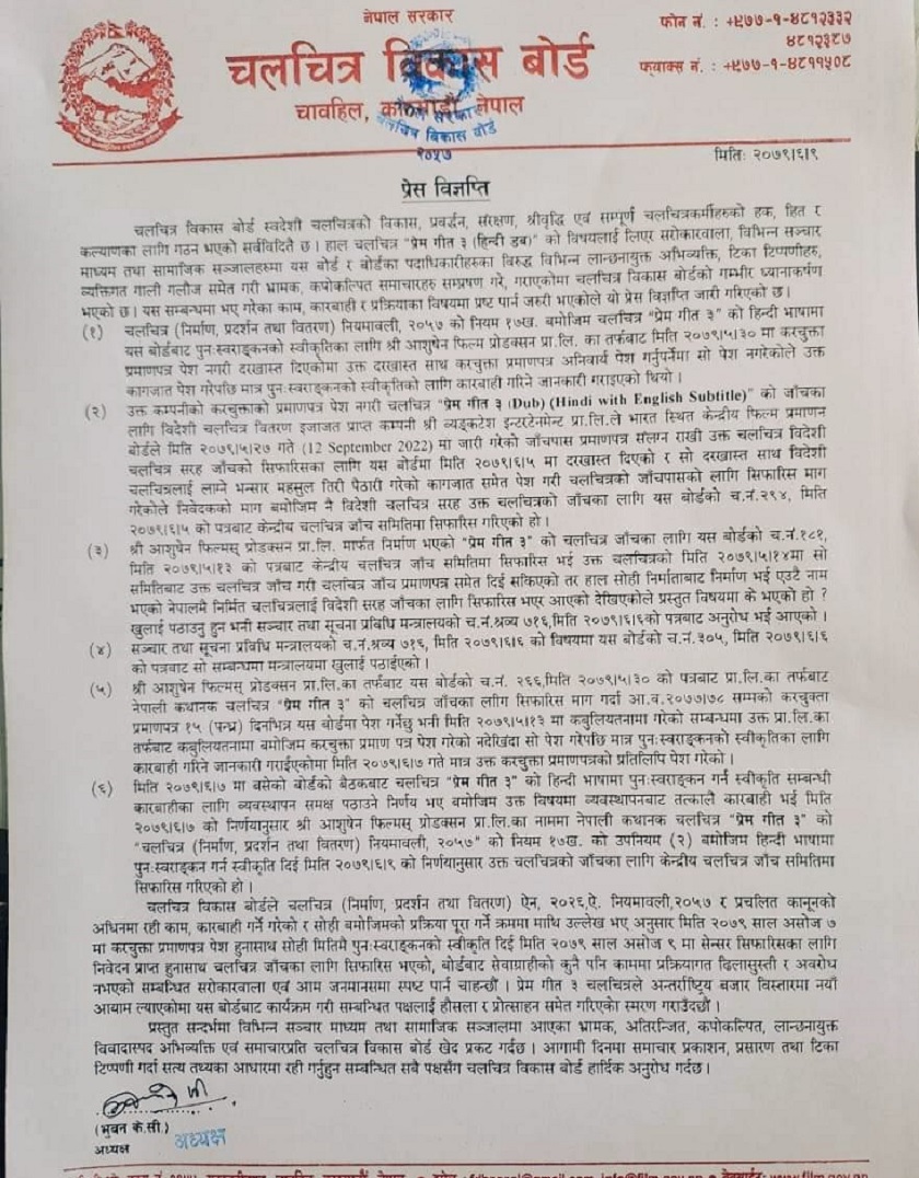 चलचित्र विकास बोर्डले शुक्रबारदेखि रिलिजमा आएको फिल्म ‘प्रेमगीत ३’ को सरोकारवालाले हिन्दी स्वरांकनको बिषयलाई लिएर बोर्डका पदाधिकारी तथा सदस्यहरूप्रति गरिएको भ्रामक, अतिरञ्जित, कपोकल्पित, लान्छनायुक्त, विवादास्पद समाचारप्रति ध्यानाकर्षण भएको जनाएको छ ।