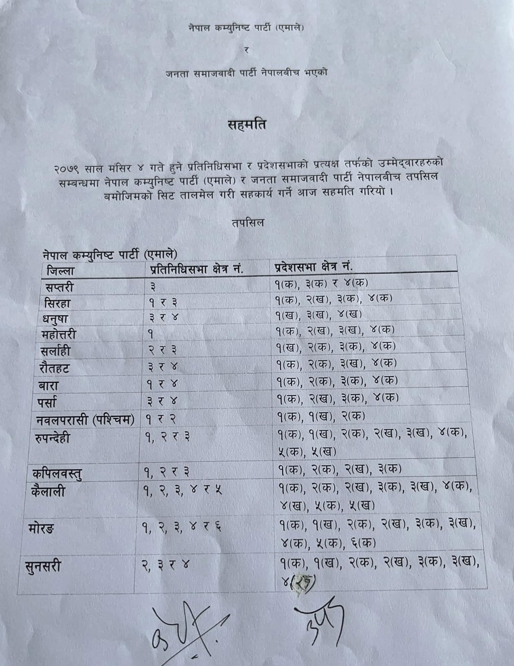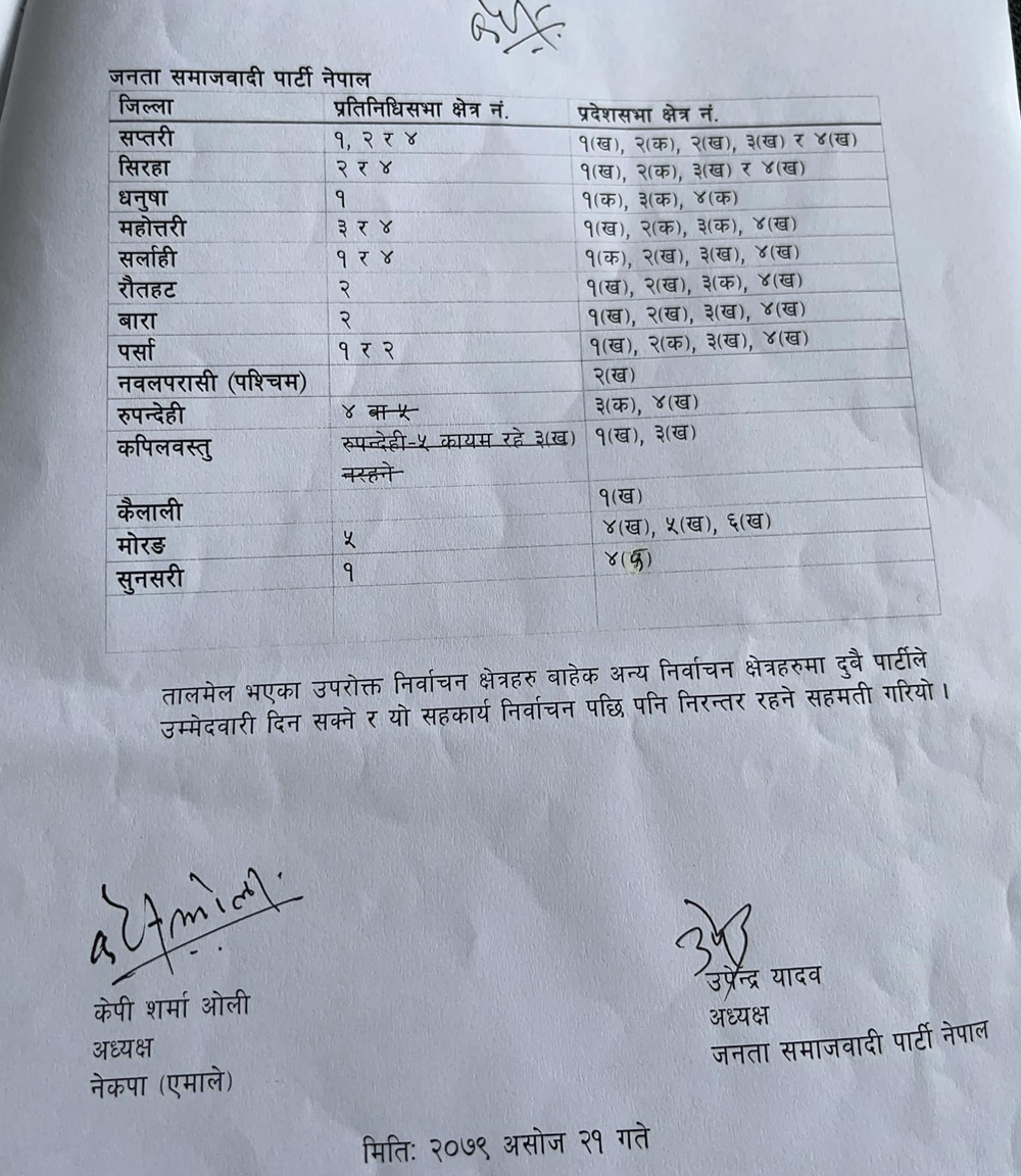 एमाले र जसपाबीच १४ जिल्लामा चुनावी तालमेलको सहमति भएको हो । मधेस प्रदेशका ८ जिल्ला, प्रदेश १ को मोरङ र सुनसरी तथा लुम्बिनी प्रदेशको नवलपरासी पश्चिम, रुपन्देही र कपिलवस्तु तथा सुदूरपश्चिमको कैलालीमा तालमेलको सहमति भएको हो । यसअनुसार यी जिल्लामा प्रतिनिधिसभाका ३५ सिट एमालेले लिनेछ भने जसपाले १७ सिट लिने भएको छ ।