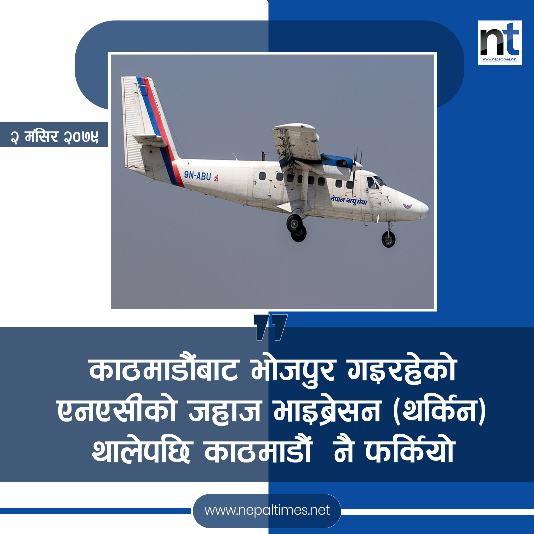 काठमाडौंबाट पहाडी जिल्ला भोजपुरका लागि उडान भरेको नेपाल वायुसेवा निगमको ट्वीनअटर काठमाडौं नै फर्किएको छ । फ्लाइट कन्ट्रोल सिस्टममा देखिएको समस्याका कारण जहाज भाइब्रेसन (थर्किने) हुन थालेपछि भोजपुरतर्फ उडिरहेको ट्वीनअटर काठमाडौं नै फर्किएको हो ।