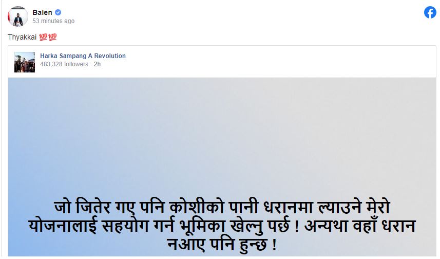 त्यसको पहल भने काठमाडौंका मेयर बालेनले गरेका छन् । बालेनले हर्क साम्पाङको एउटा फेसबुक पोस्टलाई आफ्नो समर्थनसहित सेयर गरेका छन् । हर्कले धरानमा कोशीको पानी ल्याउने विषयमा स्टाटस लेखेका थिए । पुरानो तुष बिर्सिँदै बालेनले उनको स्टाटस सेयर गरिदिएका हुन् ।