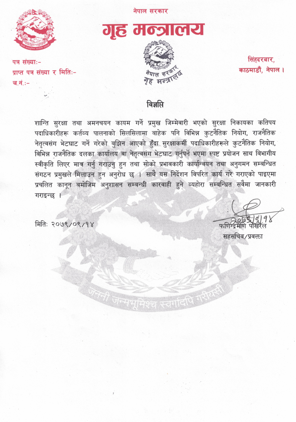 विज्ञप्तिमा भनिएको छ, ’शान्ति सुरक्षा तथा अमनचयन कायम गर्ने प्रमुख जिम्मेवारी भएको सुरक्षा निकायका कतिपय पदाधिकारीहरू कर्तव्य पालनाको सिलसिलामा बाहेक पनि विभिन्न कूटनीतिक नियोग, राजनीतिक नेतृत्वसँग भेटघाट गर्ने गरेको बुझिन आएको हुँदा सुरक्षाकर्मी पदाधिकारीहरूले कूटनीतिक नियोग, विभिन्न राजनीतिक दलका कार्यालय वा नेतृत्वसँग भेटघाट गर्नुपर्ने भएमा स्पष्ट प्रयोजन साथ विभागीय स्वीकृति लिएर मात्र गर्नु गराउनु हुन तथा सोको प्रभावकारी कार्यान्वयन तथा अनुगमन सम्बन्धित संगठन प्रमुखले मिलाउन हुन अनुरोध छ । साथै यस निर्देशनविपरीत कार्य गरे÷गराएको पाइएमा प्रचलित कानुनबमोजिम अनुशासनसम्बन्धी कारबाही हुने व्यहोरा सम्बन्धित सबैमा जानकारी गराइन्छ ।’