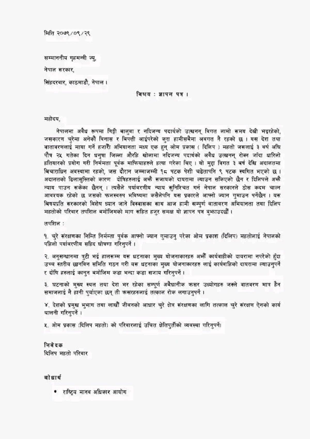 धनुषा औराही खोलामा बालुवा–गिट्टी दोहन रोक्न र चुरे संमक्षणको एक्लो अभियानमा लाग्दा तीन वर्षअघि मारिएका ओम प्रकाश (दिलीप) महतोकी आमा र दुई बहिनीले गृहमन्त्री लामिछानेलाई ज्ञापनपत्र बुझाएका छन् । घटनाको ३ वर्ष बित्दा समेत आफूहरुले न्याय नपाएको भन्दै दिलीप महतोलाई पर्यावरणीय सहिद घोषणा गर्नुपर्नेसहित पाँच बूँदे माग पेश गर्दै उनको परिवारले गृहमन्त्रीलाई ज्ञापनपत्र बुझाएको हो।