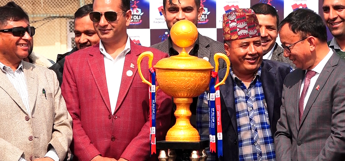 नेकपा (एमाले) निकट राष्ट्रिय युवा संघको आयोजनामा केपी ओली कप २०२३ राष्ट्रिय फुटबल प्रतियोगिताको प्रतियोगिताको ट्रफी अनावरण र अफिसियल गीत सार्वजनिक भएको छ । केपी ओली कप २०२३ राष्ट्रिय फुटबल प्रतियोगिताको उद्घाटन फागुन ११ गते एन्फा कम्प्लेक्स सातदोबाटोमा हुने भएको हो ।