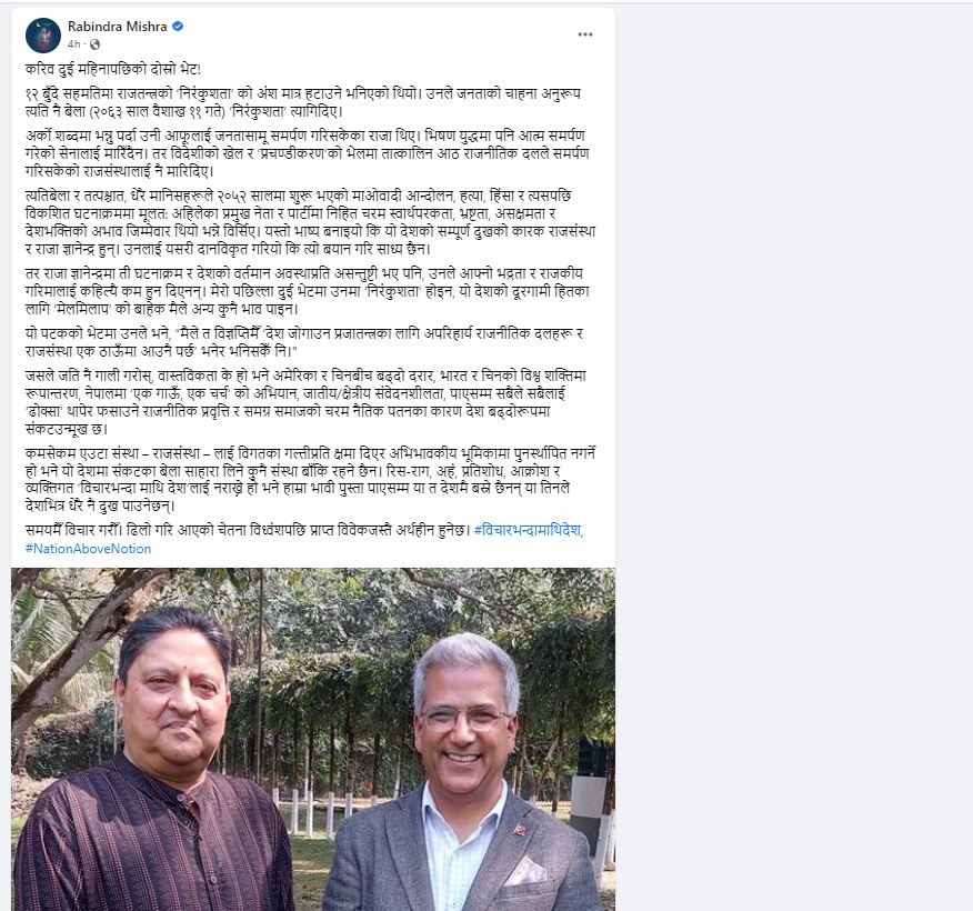 उनले लेखेका छन्, कमसेकम एउटा संस्था – राजसंस्था – लाई विगतका गल्तीप्रति क्षमा दिएर अभिभावकीय भूमिकामा पुनर्स्थापित नगर्ने हो भने यो देशमा संकटका बेला साहारा लिने कुनै संस्था बाँकी रहने छैन। रिस–राग, अहं, प्रतिशोध, आक्रोश र व्यक्तिगत ‘विचारभन्दा माथि देश’लाई नराख्ने हो भने हाम्रा भावी पुस्ता पाएसम्म या त देशमै बस्ने छैनन् या तिनले देशभित्र धेरै नै दुख पाउनेछन्। समयमैँ विचार गरौँ। ढिलो गरि आएको चेतना विध्वंशपछि प्राप्त विवेकजस्तै अर्थहीन हुनेछ।