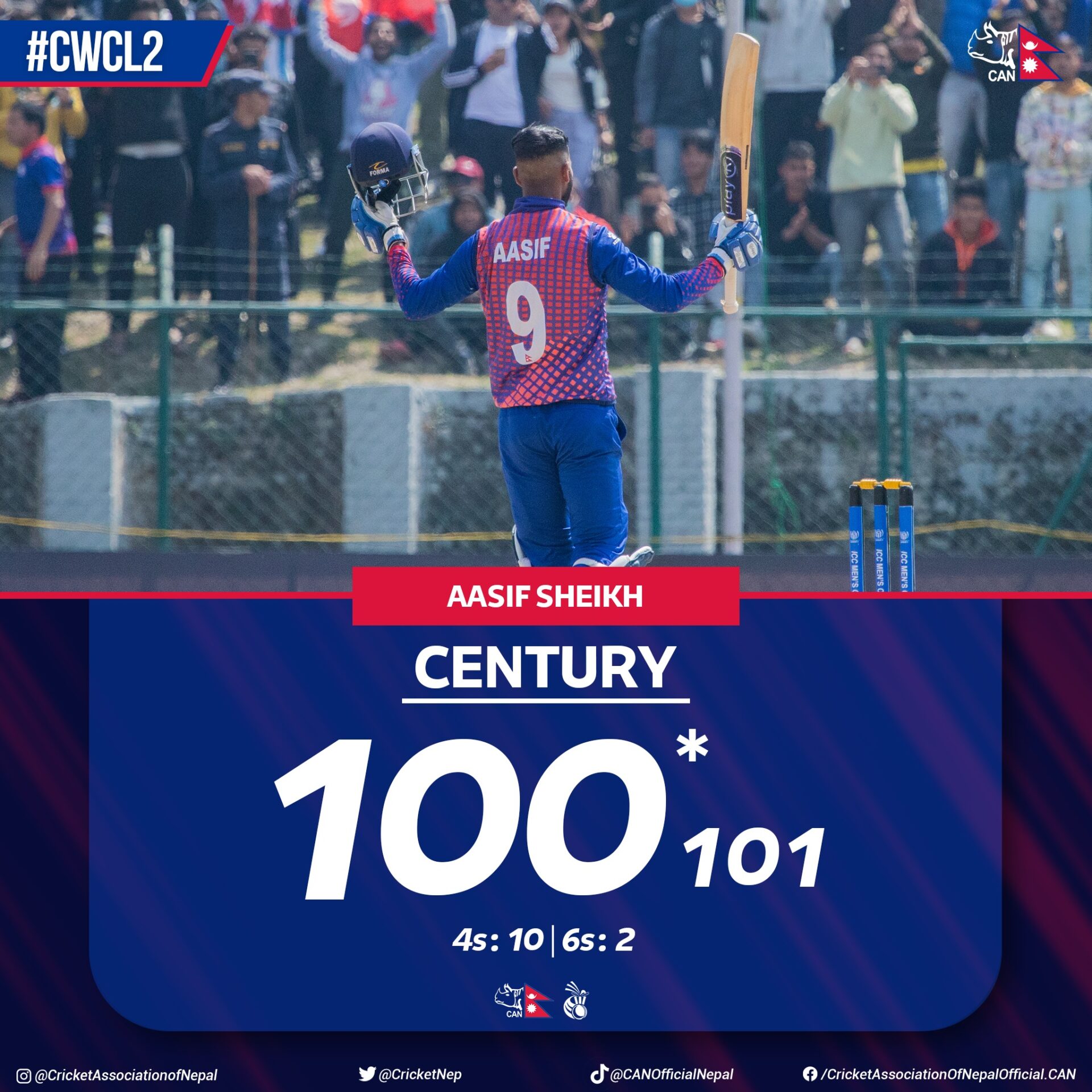 नेपालका विकेटकिपर ब्याट्सम्यान आशिफ शेखले एकदिवसीय करियरको पहिलो शतक बनाएका छन् । आईसीसी पुरुष एकदिवसीय क्रिकेट विश्वकप लिग २ अन्तर्गत पीएनजीविरुद्ध जारी खेलमा नेपालका ओपनर आशिफ शेखले एकदिवसीय करियरको पहिलो शतक बनाएका हुन् ।