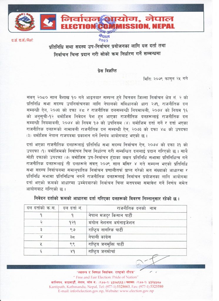 दर्ता भएका दलहरुलाई आयोगले चुनाव चिह्न पनि प्रदान गरेको छ । १० वैशाखको उपनिर्वाचनमा गत ४ मंसिरको चुनावमा दलहरुले समानुपातिक पद्धतितर्फ पाएको मतको आधारमा क्रम निर्धारण गरिएको र त्यही आधारमा मतपत्रमा नाम राखिने पनि आयोगले जनाएको छ ।