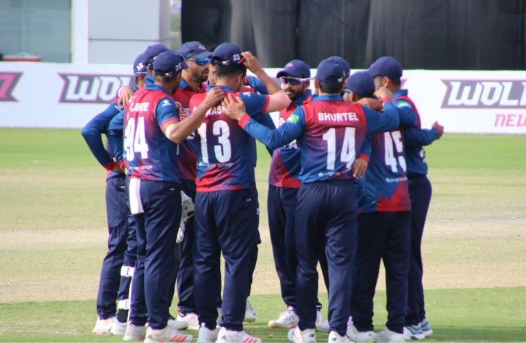 सन्दीप लामिछाने ७ रनमा आउट भए । आरिफ शेख १५ रनमा आउट भए । भीम सार्की ३८ बलमा ४ चौकासहित ४४ रनमा आउट भए । नेपालले अव आइतबार युएई, सोमबार पपुवा न्युगिनी र बिहीबार युएईसँग खेल्नेछ ।