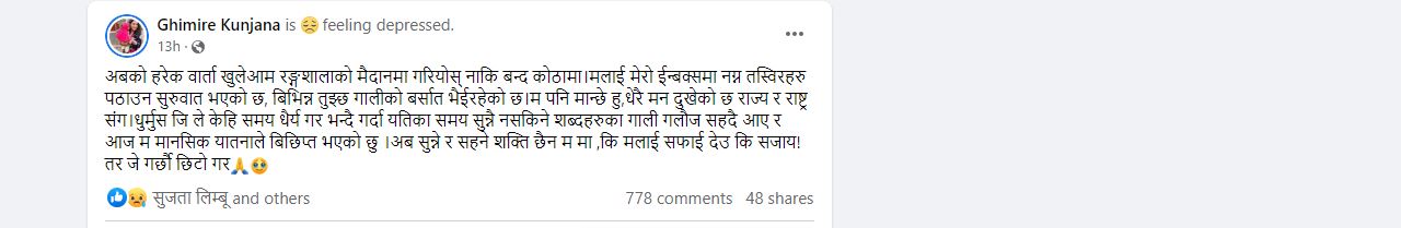 ‘अब सुन्न र सहन सक्ने शक्ति छैन ममा, कि मलाई सफाइ देऊ कि सजाय । तर जे गर्छौ छिटो गर ।’ आफूलाई तुच्छ गालीको वर्षा भइरहेको भन्दै कुञ्जनाले राज्यसँग मन दुखेको टिप्पणी गरेकी छन् । उनले लेखेकी छन्, ‘अबको हरेक वार्ता खुलेआम रंगशालाको मैदानमा गरियोस् न कि बन्द कोठामा । मलाई मेरो इनबक्समा नग्न तस्वीर पठाउन सुरू भएको छ, विभिन्न तुच्छ गालीको वर्षा भइरहेको छ । म पनि मान्छे हँु, धेरै मन दुखेको छ राज्य र राष्ट्रसँग ।’