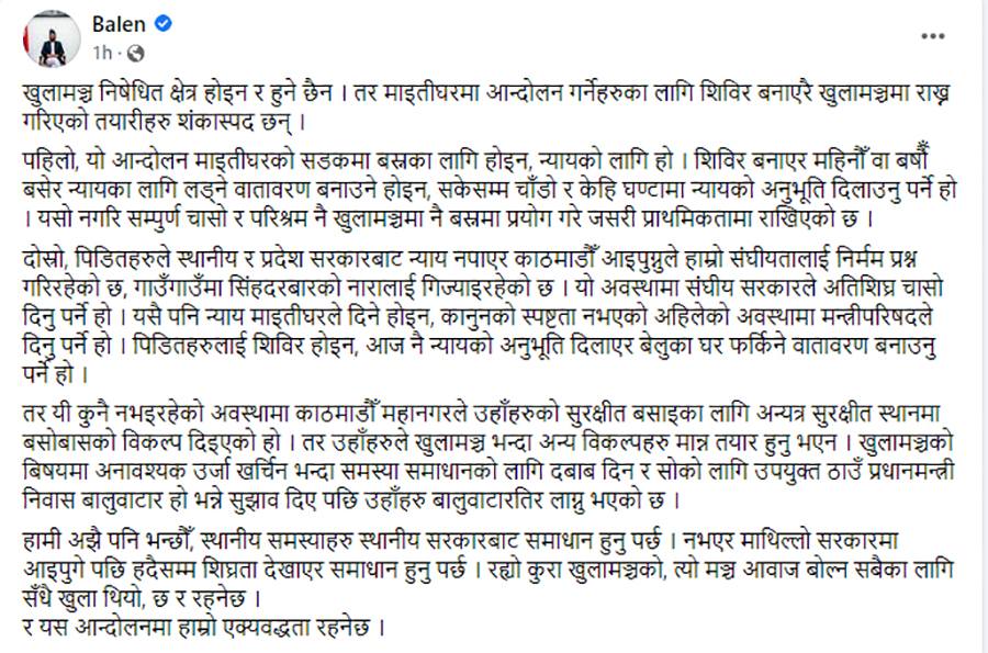 यो अवस्थामा संघीय सरकारले अतिशिघ्र चासो दिनुपर्ने हो।’ उनले पिडितहरूलाई शिविर होइन, आज नै न्यायको अनुभूति दिलाएर बेलुका घर फर्किने वातावरण बनाउनुपर्ने बताए । खुलामञ्च निषेधित क्षेत्र नभएको तर माइतीघरमा आन्दोलन गर्नेहरुका लागि शिविर बनाएरै खुलामञ्चमा राख्न गरिएको तयारी शंकास्पद भएको उनले बताएका छन् ।