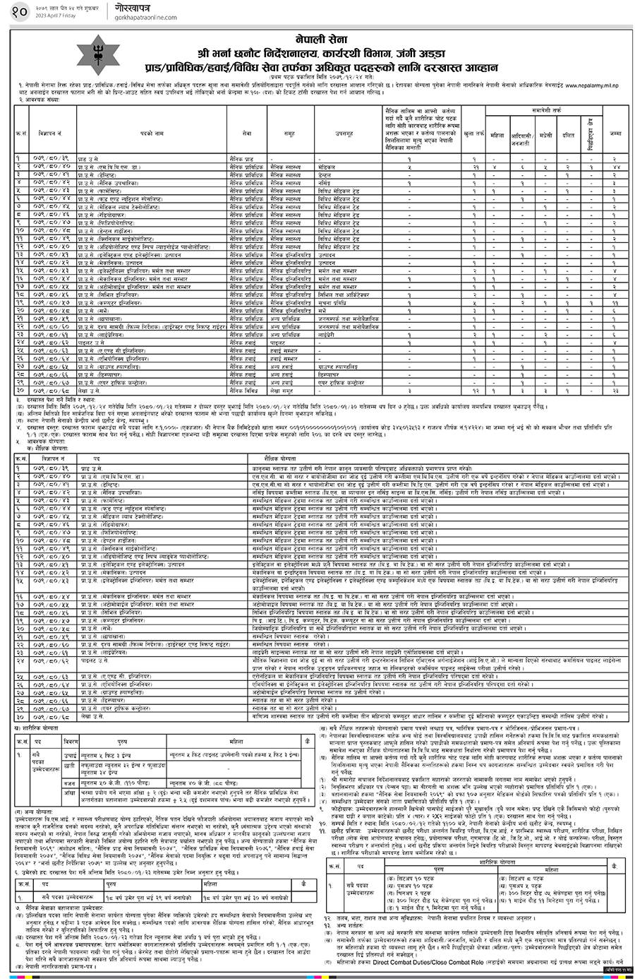 सेनाले खुला तथा समावेशी प्रतियोगिताद्वारा पदपूर्ति गर्न १३७ जना माग गर्दै आज गोरखापत्रमा सूचना निकालेको छ । १८ वर्ष पूरा भई २९ वर्ष ननाघेको पुरूष र १८ वर्ष पूरा भई ३० वर्ष ननाघेको महिलाले फारम भर्न सक्नेछन् । उचाई भने पुरूषको ५ फिट ३ इन्च र महिलाको न्यूनतम ५ फिट हुनुपर्ने सूचनामा उल्लेख छ ।