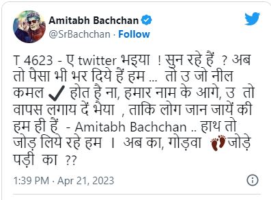 यस्तोमा जस जसले डलर तिरेका छन् उनीहरुको ‘ब्लु टिक’ यथावत छ । तर पैसा तिरेर पनि आफ्नो ‘ब्लु टिक’ खोसिएको भन्दै अमिताभले भने ट्विटरसँग गुनासो गरेका छन् । ’ए ट्विटर भाइ । सुनिरहेका छौँ? अब त पैसा पनि पठाइदिइसकेँ मैले… त्यसैले जुन निल कमल हुन्छ नि, हाम्रो नामअगाडि, त्यो त अब फिर्ता गरेर लगाइदेऊ भाइ, ताकि मानिसले मलाई म नै अमिताभ बच्चन हो भन्ने चिनुन् ।