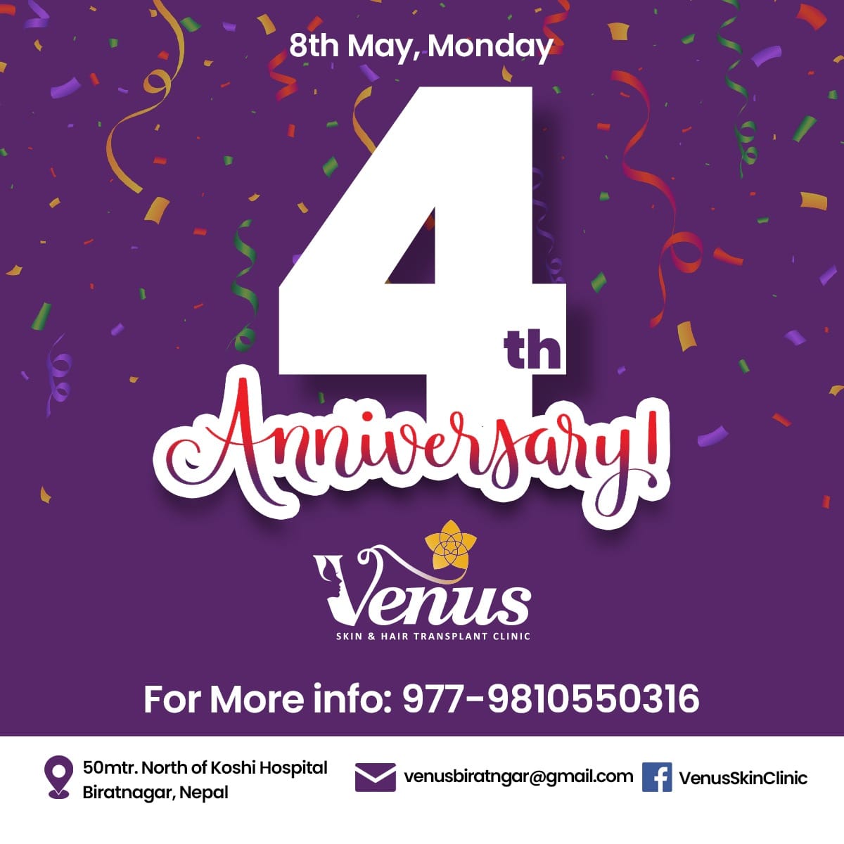 विराटनगर स्थित भेनस क्लिनिकले सोमबार आफ्नो चौथो वार्षिक उत्सव सम्पन्न गरेको छ । विराटनगरको अस्पताल चोकमा २०७६ सालदेखि सेवा दिदै आएको भेनस क्लिनिकले सेवाग्राहीका साथमा आफ्नो वार्षिकउत्सव मनाएको हो ।