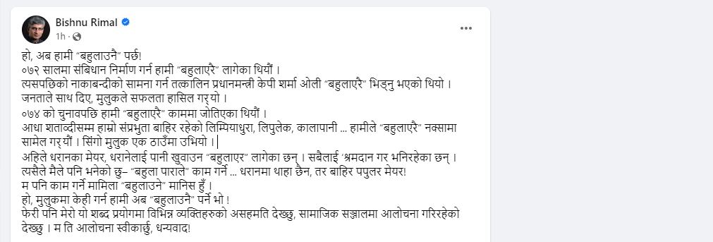 सबैलाई ‘श्रमदान गर भनिरहेका छन् । त्यसैले मैले पनि भनेको छु– “बहुला पाराले” काम गर्ने … धरानमा थाहा छैन, तर बाहिर पपुलर मेयर! म पनि काम गर्ने मामिला “बहुलाउने” मानिस हुँ । हो, मुलुकमा केही गर्न हामी अब “बहुलाउनै” पर्ने भो ! फेरी पनि मेरो यो शब्द प्रयोगमा विभिन्न व्यक्तिहरुको असहमति देख्छु, सामाजिक सञ्जालमा आलोचना गरिरहेको देख्छु । म ति आलोचना स्वीकार्छु, धन्यवाद !