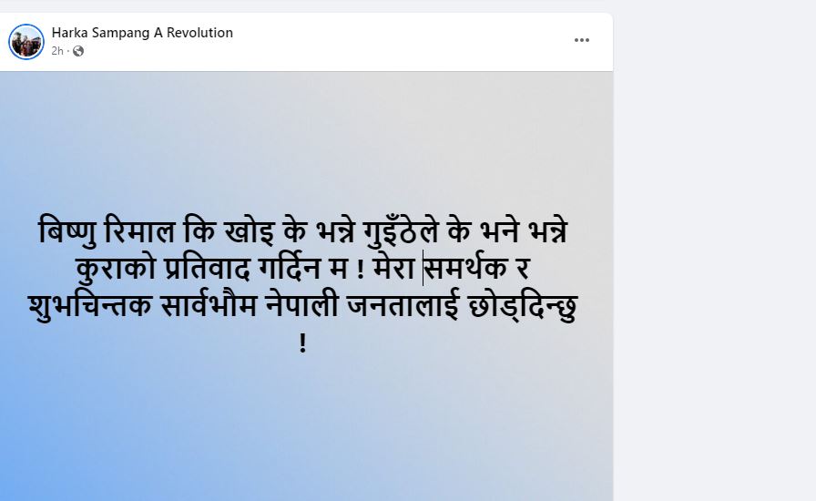 उनले सामाजिक सञ्जालमा लेखेका छन् –’एमालेको एउटा भुसुनोले मुखबाट गोबर उकेलेछ।अब आउने चुनावमा यसलाई जनताले देखाइदिनेछन्।’ शनिबार अखिल नेपाल महिला सङ्घ अनेमसंघको दोस्रो पूर्ण बैठकमा उपमहासचिव रिमालले धरानका प्रमुख हर्क साम्पाङलाई ‘बौलाहा मेयर’ को रूपमा चित्रण गरेका थिए ।