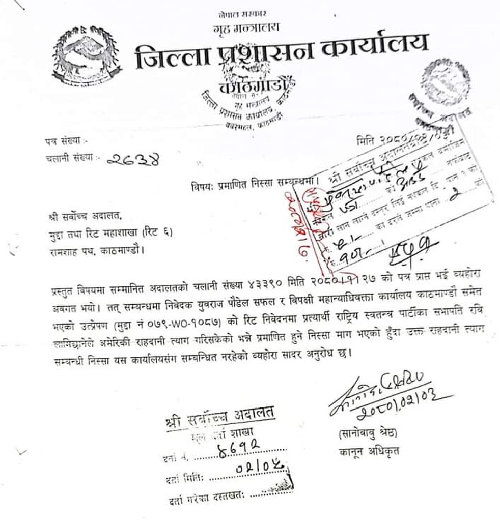 जिल्ला प्रशासन कार्यालय काठमाडौंले राष्ट्रिय स्वतन्त्र पार्टी (रास्वपा) का सभापति एवं सांसद रवि लामिछानेले अमेरिकी राहदानी त्यागेको प्रमाण (निस्सा) फेला नपरेको तथ्य सहितको पत्र सर्वोच्च अदालत पठाएको छ। जिल्ला प्रशासन कार्यालय काठमाडौंले लामिछानेले अमेरिकी राहदानी त्यागेको निस्सा नभेटिएको भन्दै सर्वोच्च अदालतलाई पत्र पठाएपछि यो तथ्य भेटिएको हो ।