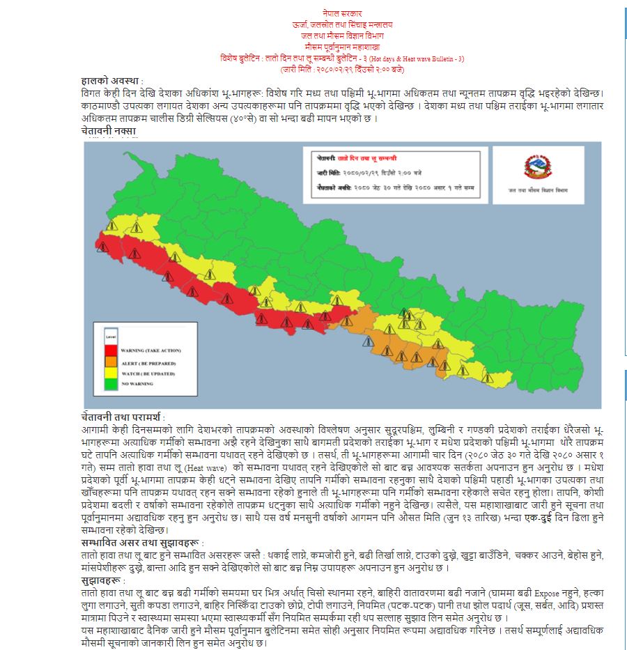 जल तथा मौसम विज्ञान विभाग मौसम पूर्वानुमान महाशाखाले देशका तराई भू–भागमा आगामी पाँच दिनसम्म तातो हावा (लू)को सम्भावना रहेकाले सोबाट बच्न आवश्यक सतर्कता अपनाउन अनुरोध गरेको छ। तातो दिन तथा लूसम्बन्धी विशेष बुलेटिन निकालेर महाशाखाले अबका पाँच दिनसम्म आवश्यक सतर्कता अपनाउन अनुरोध गरेको हो।