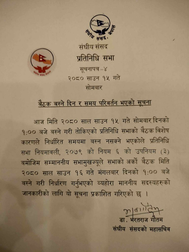 यसमा सत्तापक्ष तयार भएको छैन । यसअघि १० साउनमा बोलाइएको बैठकमा उच्चस्तरीय छानबिन समितिको माग गर्दै एमालेले बैठक अवरुद्ध गरेको थियो । सोमबार पनि एमालेले त्यही अडान राखेपछि सरकारको आग्रहमा सभामुख देवराज घिमिरेले प्रतिनिधिसभाको बैठक मंगलबार दिउँसो १ बजेसम्मका लागि स्थगित गरेका सभामुखको सचिवालय स्रोतले बताएको छ ।