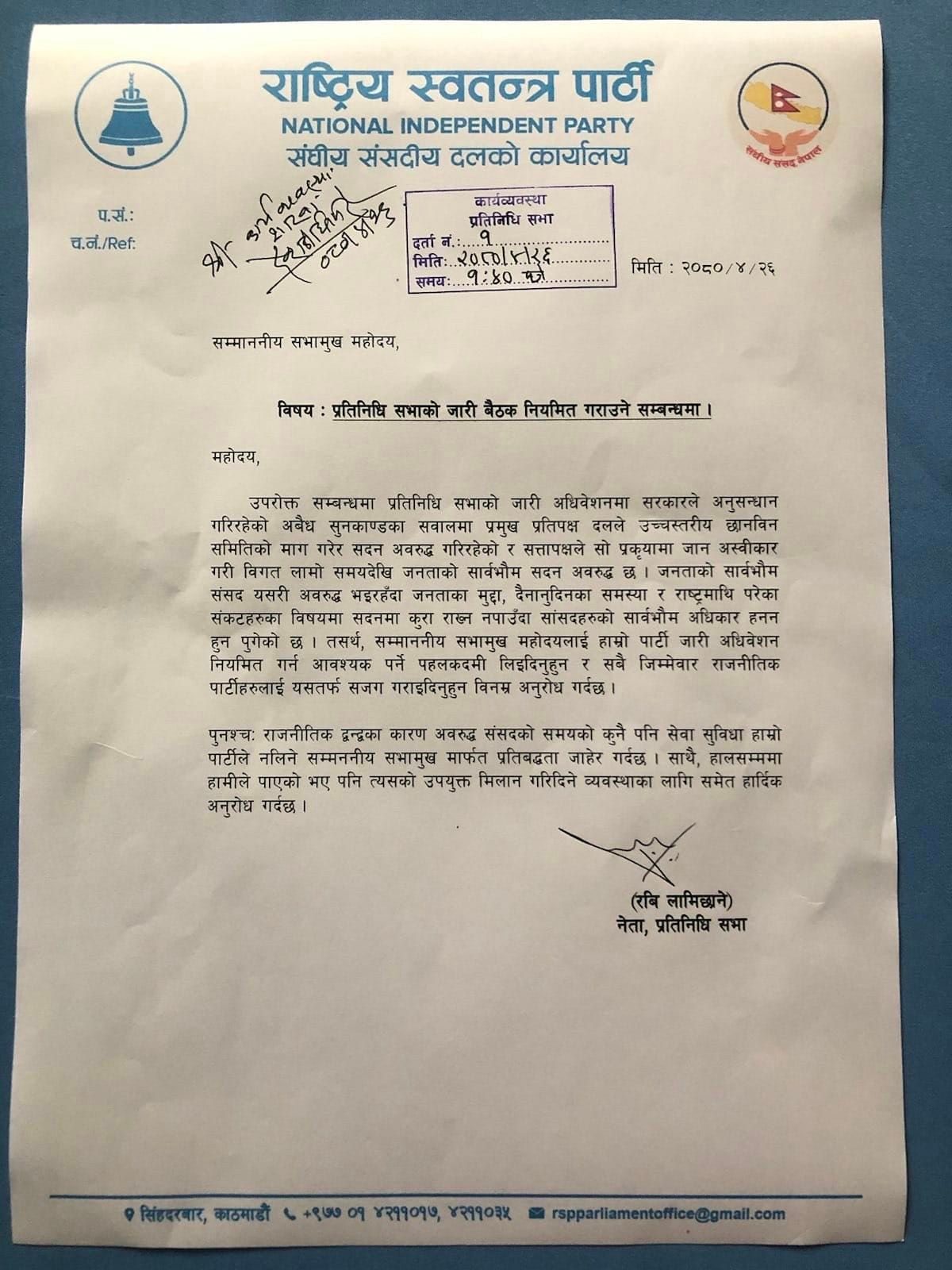 उनले भने, ‘हामीले सम्माननीय सभामुखज्युलाई संसद सुचारु गर्नको निमित्त र लोकतान्त्रिक विधि अपनाएर संसदीय अभ्यासभित्र रहेर हामीले औपचारिक रुपमा पत्र दिएका छौँ । पत्र दर्ता गराएका छौँ की नेपाली जनताका महत्वपूर्ण पक्षमा हामीले कुराकानी गर्नुपर्नेछ र सत्ता पक्ष र प्रमुख प्रतिपक्ष दल बीचको एउटा खिचातानी छ, संसदीय छानबिन समितिका विषय लिएर मतभेद छ, त्यसलाई अन्त्य गरियोस् र चाँडै संसद खुलाइयोस् भनेर पत्र दर्ता गराएका छौँ र सँगै हामीले संसद नचलेको अवस्थामा कुनैपनि बेलामा हामीले हाजिरि मात्र गरेर तलव सुविधा लिनु हुँदैन भनेर हाम्रो दलको तर्फबाट संसद नचलेको दिनको पैसा नलिने र त्यो व्यवस्था गरिदिन आग्रह गरेका छाँै ।काम नगर्दा नेपाली जनताले तिरेको करको पैसा लिनेकुरा स्वीकार्य छैन । संसद अवरुद्ध भएको बेलामा प्राप्त हुने तलव सुविधा अघिका दिनका पनि काटिदिन आग्रह गरेका छौँ ।’
