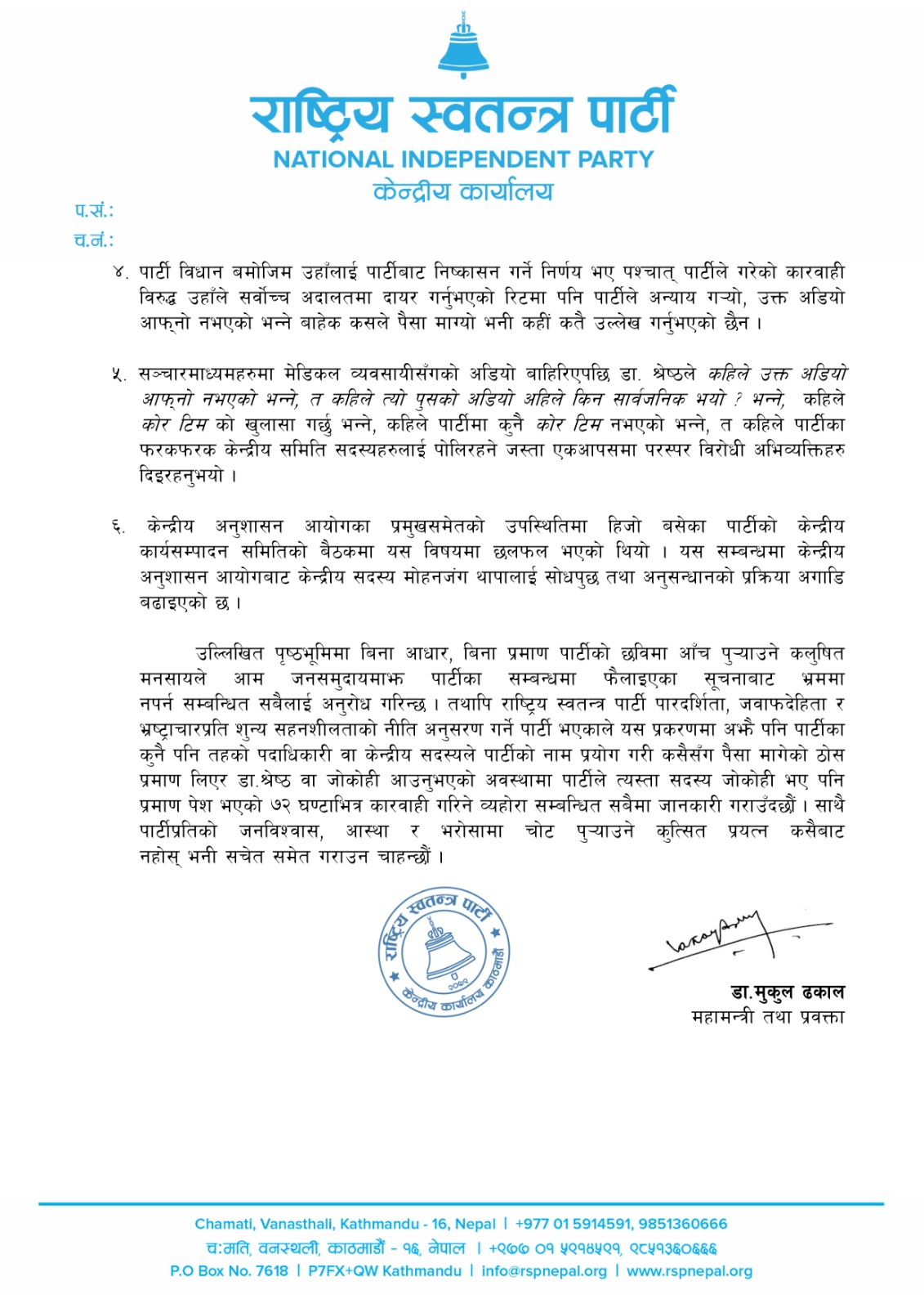 ’ बिनाआधार, बिनाप्रमाण पार्टीको छविमा आँच पु¥याउने कलुषित मनसायले आम जनसमुदायमाझ पार्टीका सम्बन्धमा फैलाइएका सूचनाबाट भ्रममा नपर्न रास्वपाले आग्रह पनि गरेको छ। ‘तथापि राष्ट्रिय स्वतन्त्र पार्टी पारदर्शिता, जवाफदेहिता र भ्रष्ट्राचारप्रति शून्य सहनशीलताको नीति अनुसरण गर्ने पार्टी भएकाले यस प्रकरणमा अझै पनि पार्टीका कुनै पनि तहको पदाधिकारी वा केन्द्रीय सदस्यले पार्टीको नाम प्रयोग गरी कसैसँग पैसा मागेको ठोस प्रमाण लिएर डा. श्रेष्ठ वा जोकोही आउनुभएको अवस्थामा पार्टीले त्यस्ता सदस्य जोकोही भए पनि प्रमाण पेश भएको ७२ घन्टाभित्र कारवाही गरिने व्यहोरा सम्बन्धित सबैमा जानकारी गराउँदछौं,’ रास्वपाको विज्ञप्तिमा भनिएको छ।