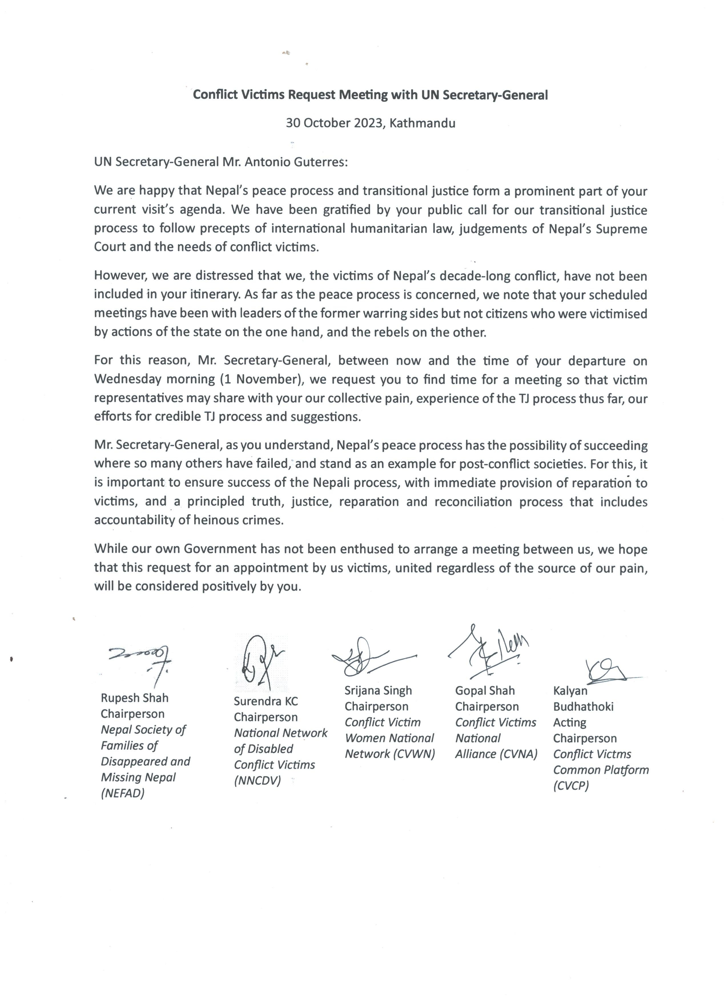 बेपत्ता परिवार समाजका अध्यक्ष रुपेश शाह, द्वन्द्व पीडित असाहय राष्ट्रिय सञ्जालका अध्यक्ष सुरेन्द्र केसी, द्वन्द्व पीडित महिला राष्ट्रिय सञ्जालकी अध्यक्ष सृजना सिंह, द्वन्द्व पीडित राष्ट्रिय संघका अध्यक्ष गोपाल शाह र द्वन्द्व पीडित साझा मञ्चका कार्यवाहक अध्यक्ष कल्याण बुढाथोकीले आज महासचिव गुटेरेसलाई आफूहरुसँग भेट गर्न संयुक्त रुपमा आग्रह गरेका हुन् ।