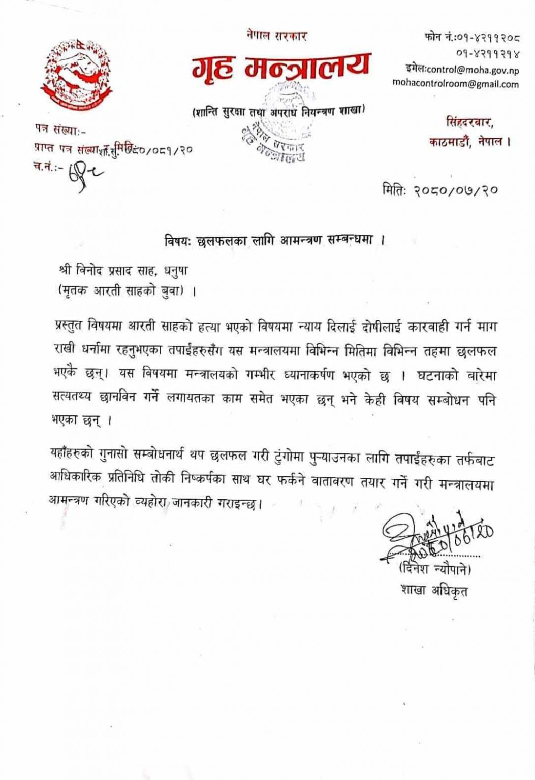 धनुषाकी आरती साहको मृत्यु प्रकरणमा लामो समयदेखि न्यायका लागि उनका माइती पक्ष आन्दोलनरत रहेको अवस्थामा गृह मन्त्रालयले आन्दोलनरत आरती शाहका आफन्तलाई ५ महिनापछि वार्तामा बोलाएको छ । आरतीका बुवा विनोदप्रसाद साहलाई सम्बोधन गर्दै वार्ताका लागि प्रतिनिधि पठाउन गृहले पत्राचार गरेको छ ।