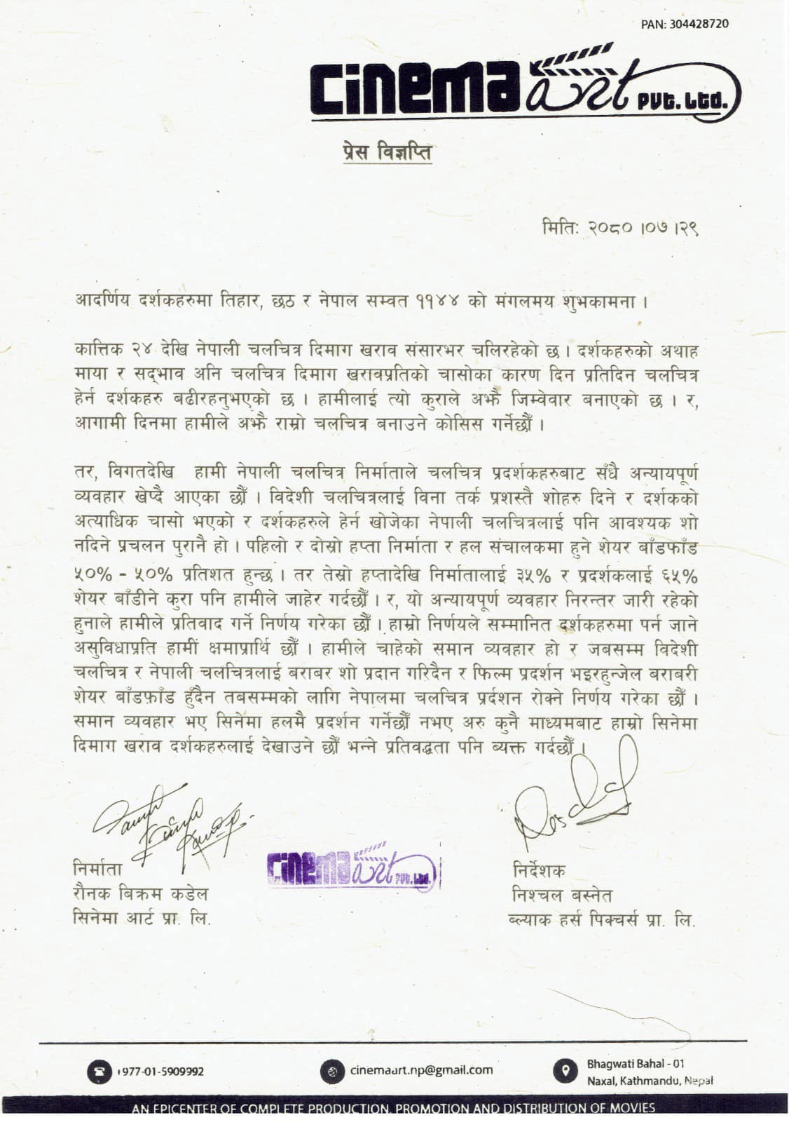 र, आगामी दिनमा हामीले अझै राम्रो चलचित्र बनाउने कोसिस गर्नेछौं, तर, विगतदेखि हामी नेपाली चलचित्र निर्माताले चलचित्र प्रदर्शकहरूबाट सधैं अन्यायपूर्ण व्यवहार खेप्दै आएका छौं। विदेशी चलचित्रलाई बिनातर्क प्रशस्तै शोहरू दिने र दर्शकको अत्यधिक चासो भएको र दर्शकहरूले हेर्न खोजेका नेपाली चलचित्रलाई पनि आवश्यक शो नदिने प्रचलन पुरानै हो,’ विज्ञप्तिमा भनिएको छ।